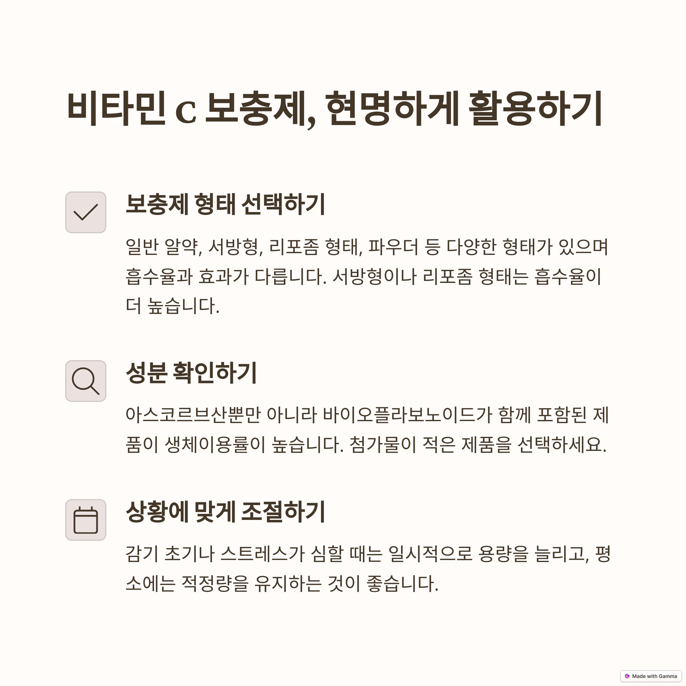 - 천연 비타민 C 선택: 합성 비타민 C보다 흡수율이 높은 천연 비타민 C를 선택하는 것이 좋습니다.