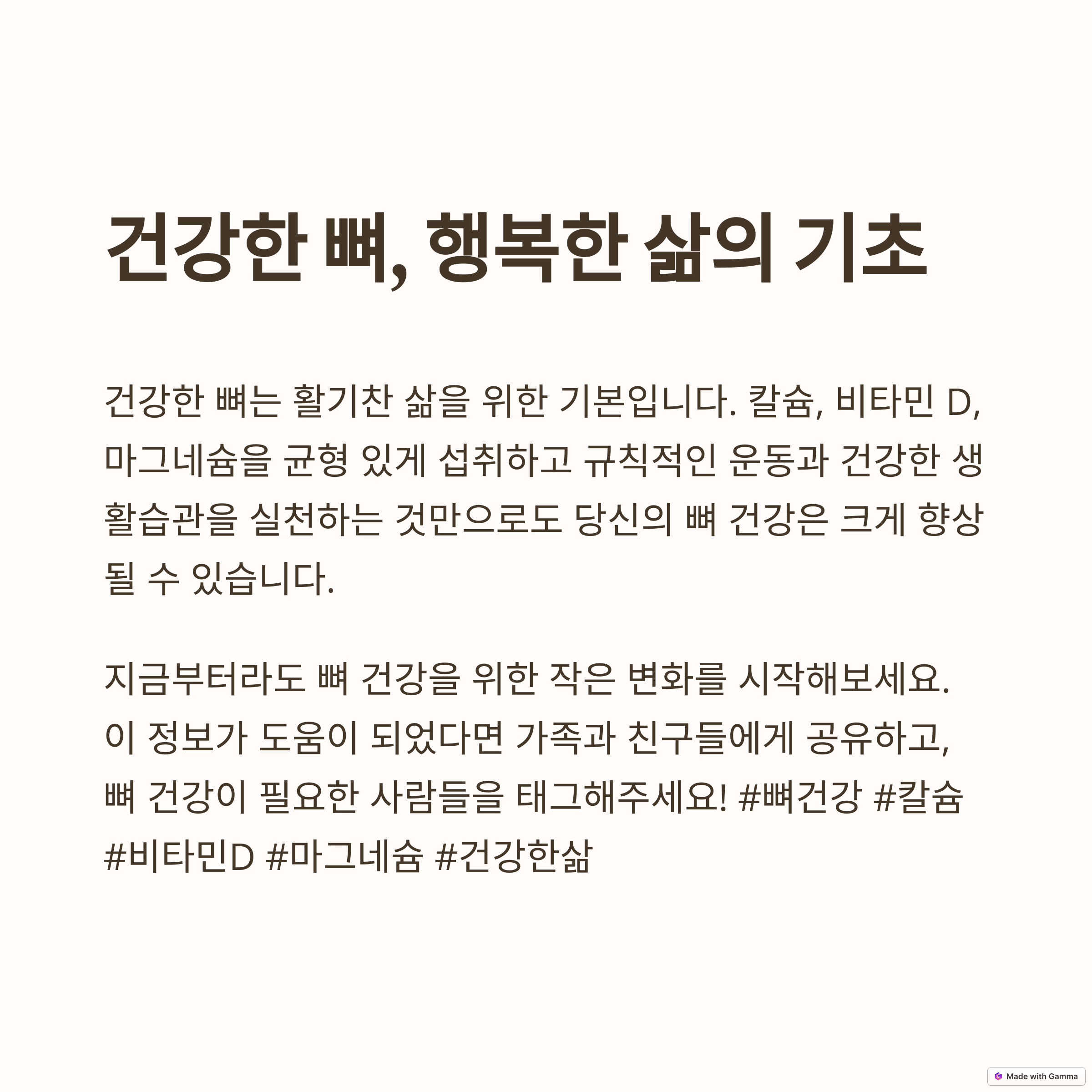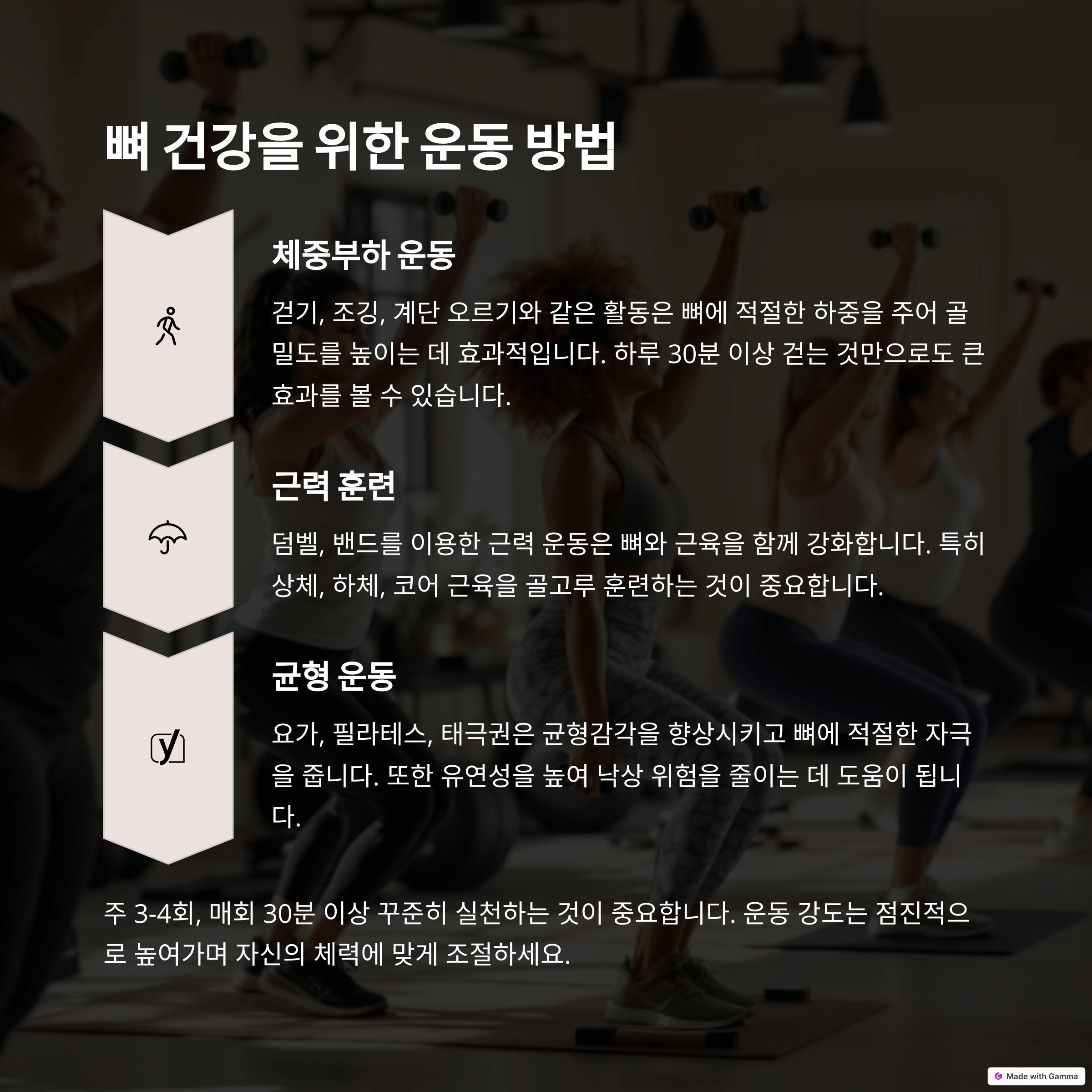 💪 뼈 건강은 건강한 식습관, 규칙적인 운동, 그리고 적절한 햇빛 노출을 통해 효과적으로 관리할 수 있습니다. 뼈 건강을 위한 생활 습관을 실천하여 튼튼한 뼈를 유지하고 골다공증을 예방하세요.
