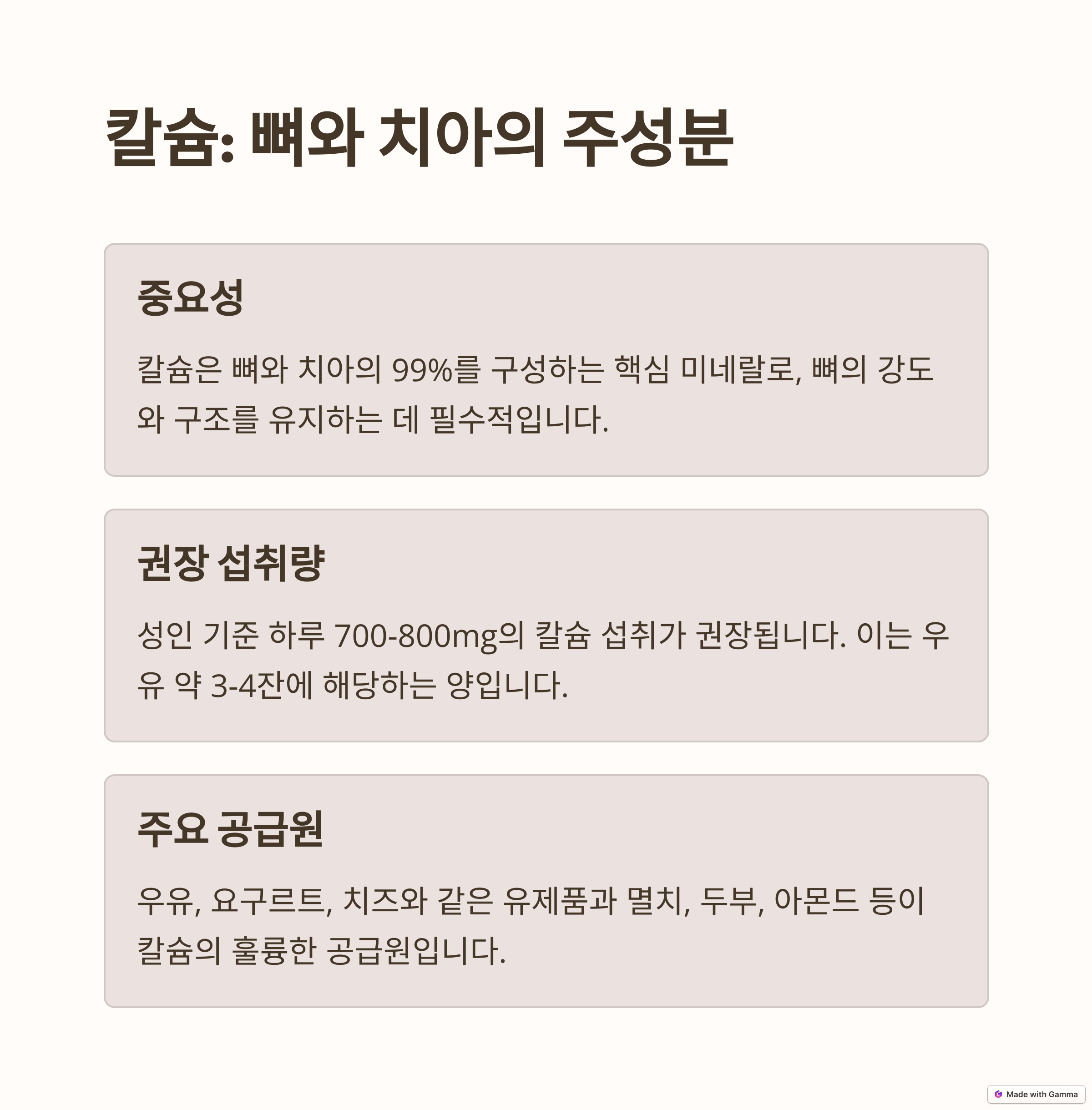🦴 칼슘은 뼈와 치아를 구성하는 가장 중요한 무기질입니다. 우리 몸 전체 칼슘의 99%가 뼈와 치아에 존재하며, 뼈의 강도를 유지하고 골밀도를 높이는 데 필수적인 역할을 합니다. 또한, 칼슘은 신경 기능, 근육 수축, 혈액 응고 등 다양한 생리적 과정에도 관여합니다. 칼슘은 단순히 뼈를 튼튼하게 하는 것 이상의 중요한 역할을 수행하며, 우리 몸의 전반적인 건강 유지에 필수적인 요소입니다.