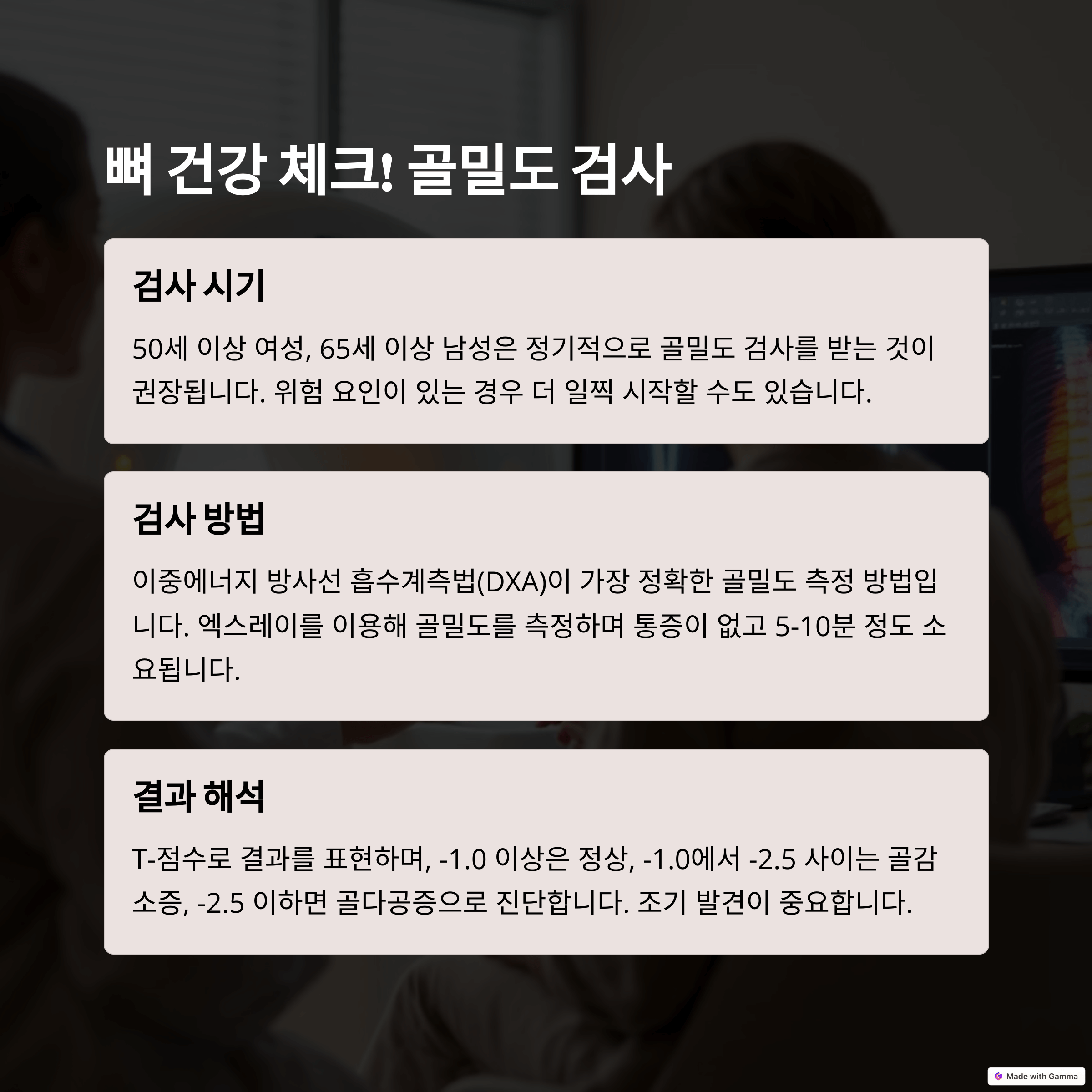- 정기적인 건강 검진: 골밀도 검사를 통해 뼈 건강 상태를 확인하고, 전문가와 상담하여 적절한 관리 계획을 세웁니다.