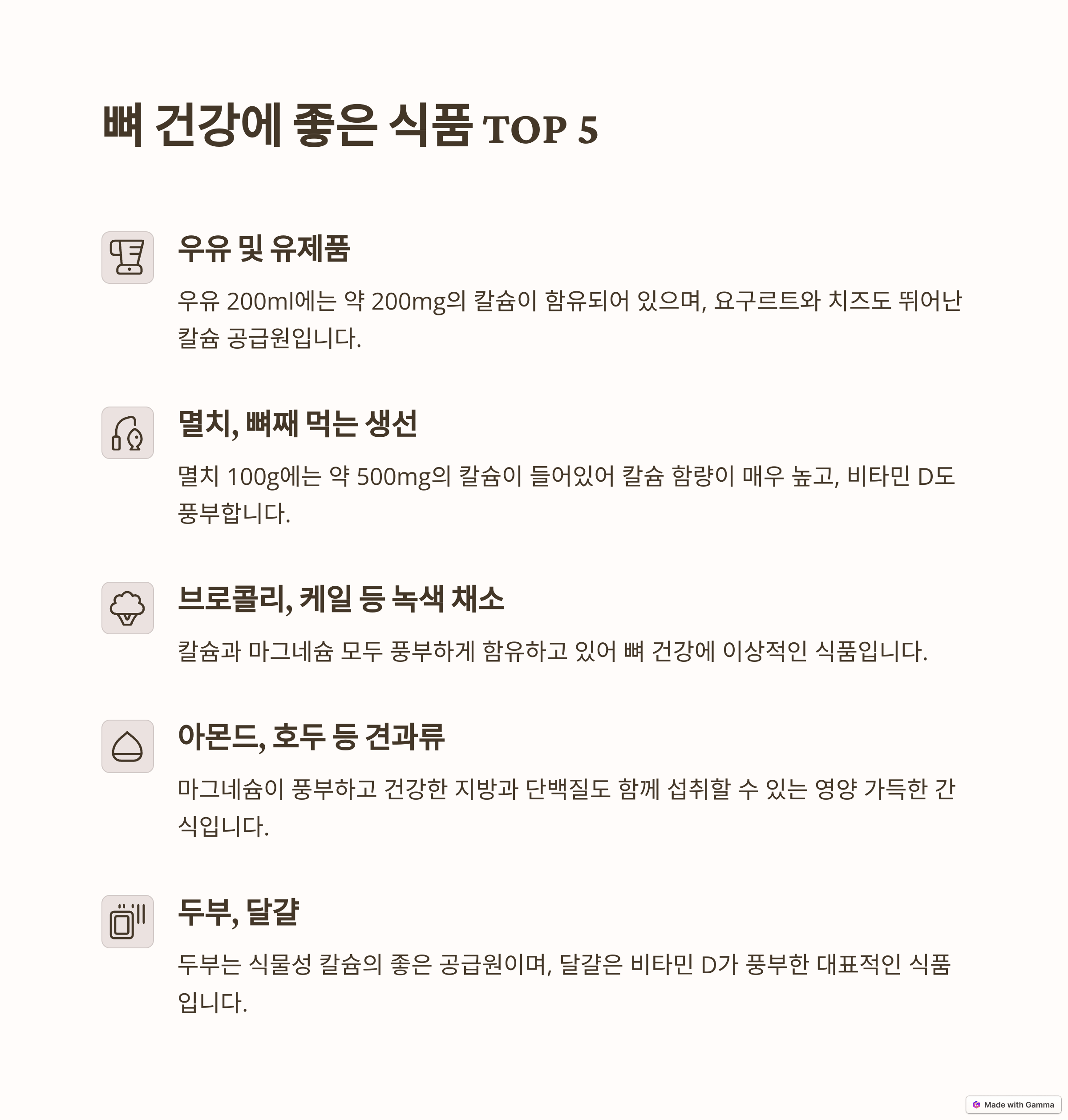 | 브로콜리 | 47mg | 비타민 K와 C도 풍부하여 뼈 건강에 도움 |