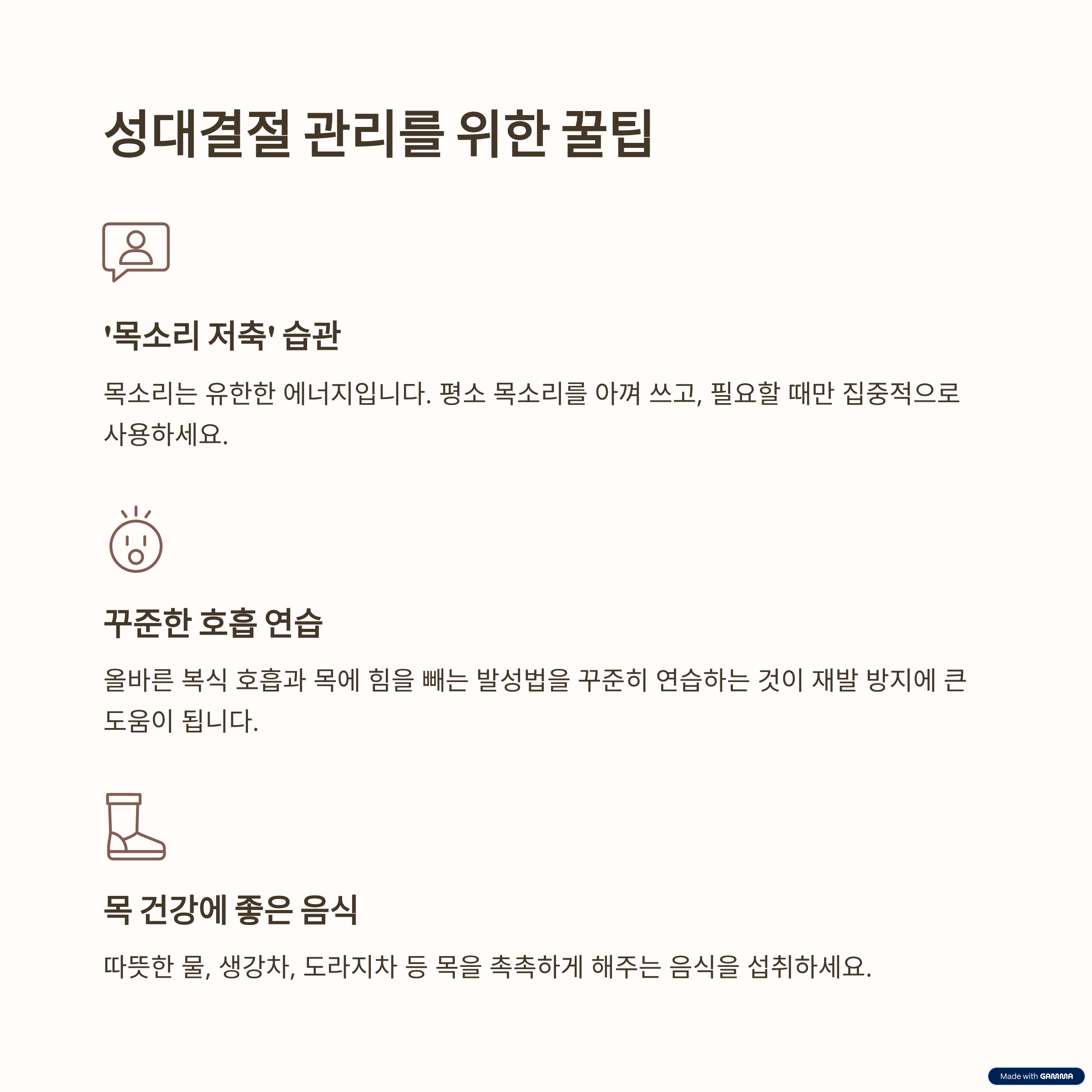 | 목소리 사용 | 소리 지르기, 속삭이기, 목에 힘주고 말하기, 무리하게 고음 내기 | '목소리 저축' 습관, 편안하고 자연스러운 발성, 목에 무리 가지 않게 대화 |