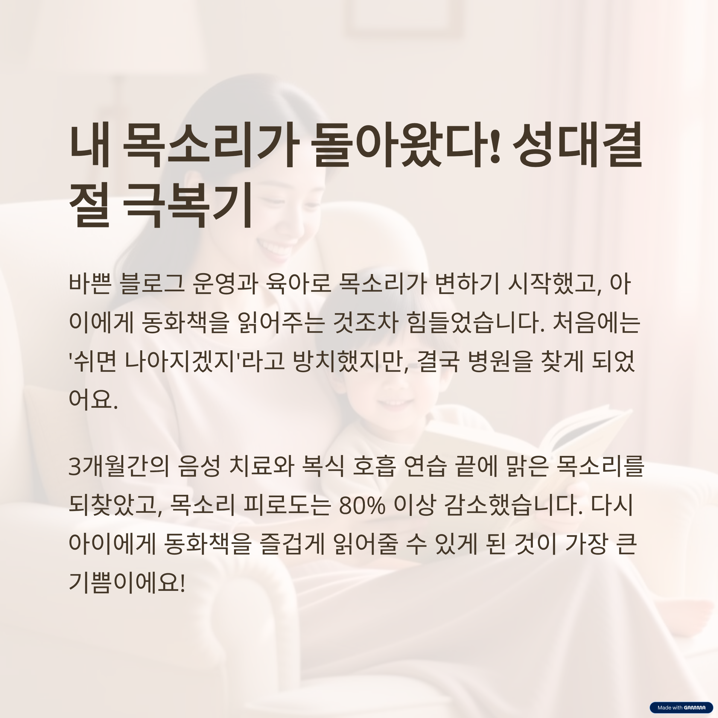 제 목소리가 변하기 시작한 건, 바쁜 블로그 운영과 콘텐츠 제작, 그리고 아이 육아를 병행하면서부터였습니다. 한창 블로그 글을 쓰느라 밤늦게까지 앉아있고, 낮에는 아이와 끊임없이 소통하며 때로는 놀이방에서 노래도 크게 불렀죠. 어느 날부터인가 아침에 일어나면 목이 잠겨 있고, 하루 종일 허스키한 쉰 목소리가 지속되었습니다. 육아를 할 때 아이에게 동화책을 읽어주는 것이 저의 큰 즐거움이었는데, 목소리가 잘 안 나오니 동화책 읽어주기도 힘들고 아이의 재롱에 마음껏 웃어주기도 어려웠어요. 제 스스로도 목소리에 자신감이 없어지고, 때로는 공황장애를 겪었던 것처럼 '내가 말을 할 수 있을까?' 하는 불안감마저 들었습니다.