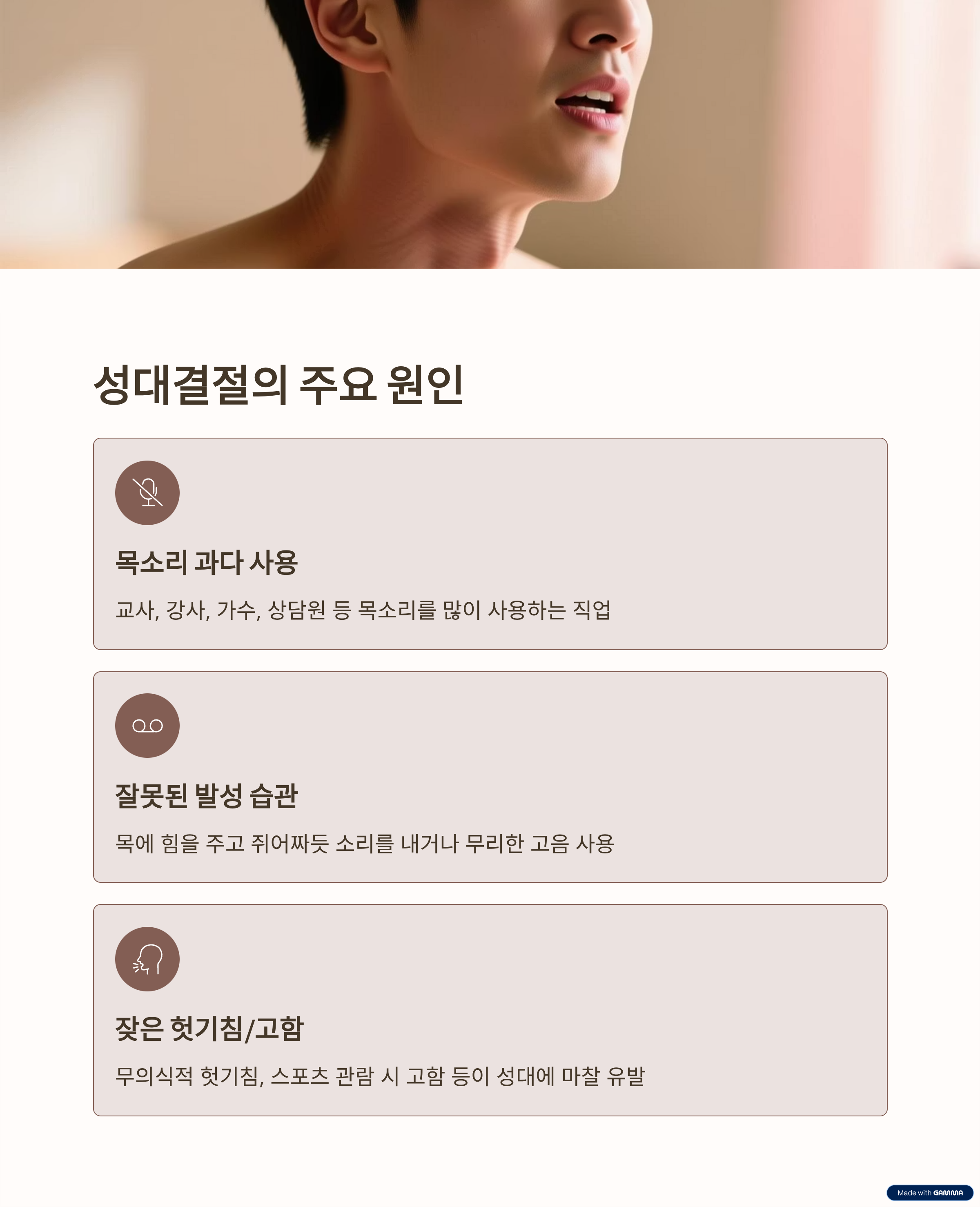 - 목소리의 과도한 사용: 교사, 강사, 가수, 상담원 등 목소리를 많이 사용하는 직업을 가진 분들에게 흔하게 나타납니다. 저처럼 블로거이더라도 육성 콘텐츠(팟캐스트, 영상)를 만들거나 대외 활동이 잦다면 목소리 사용량이 많아질 수 있습니다.