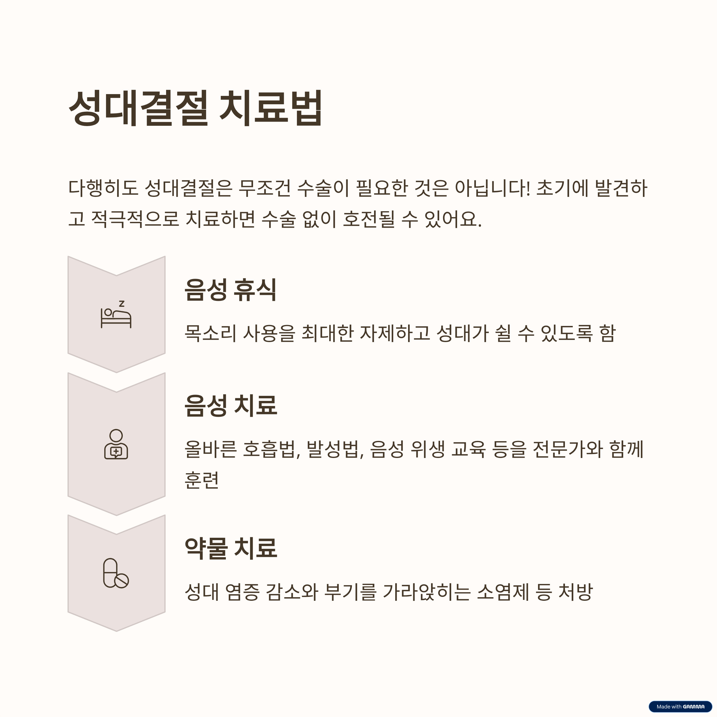 - 성대 보호를 위한 생활 습관 교정, 올바른 발성, 충분한 수분 섭취, 목쉼 방지 노력이 중요합니다.