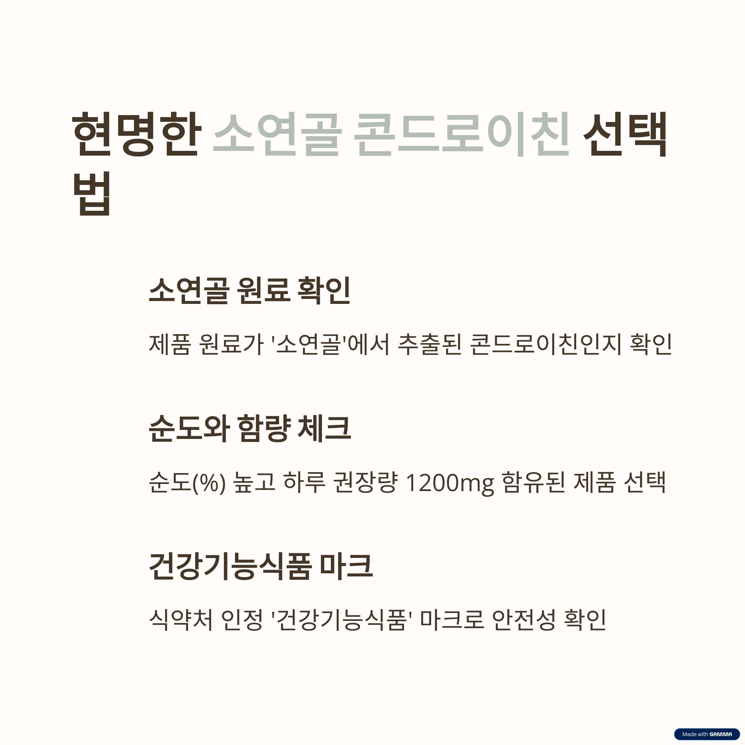- 소연골 원료 확인: 제품의 원료가 '소연골'에서 추출된 콘드로이친인지 명확히 확인하세요. 인체 연골과 유사하여 흡수율이 높습니다.