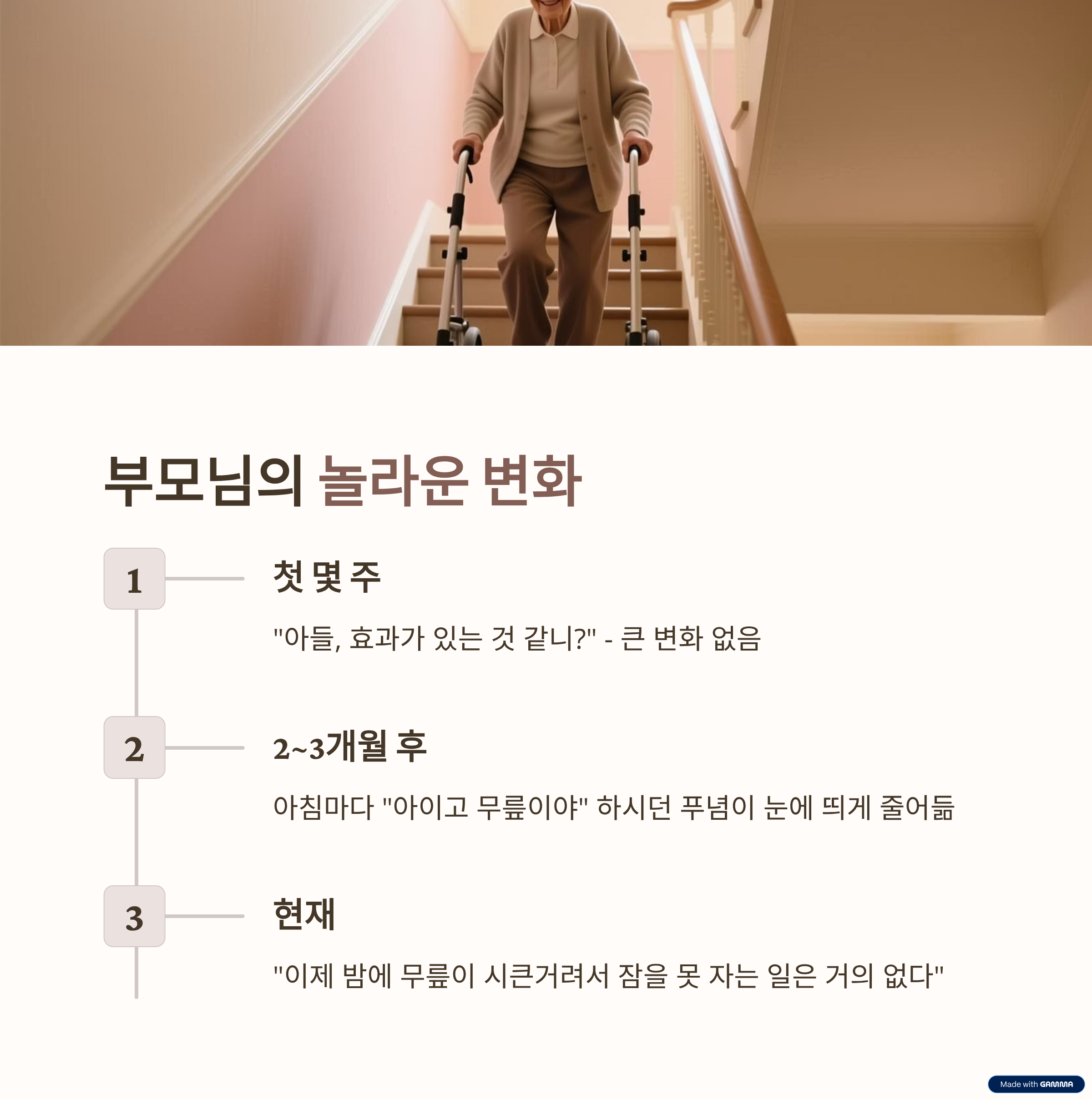 처음 몇 주간은 큰 변화가 없는 듯했습니다. "아들, 효과가 있는 것 같니?"라는 부모님의 질문에 저는 "조금 더 지켜보시죠!"라고 답할 수밖에 없었죠. 하지만 2개월, 3개월이 지나자 놀라운 변화가 찾아왔습니다. 아침마다 "아이고 허리야, 무릎이야" 하시던 부모님의 푸념이 눈에 띄게 줄었습니다. 특히 계단을 오르내리실 때 훨씬 편해 보이셨고, 한결 가벼워진 걸음걸이를 보며 저도 감탄했습니다.