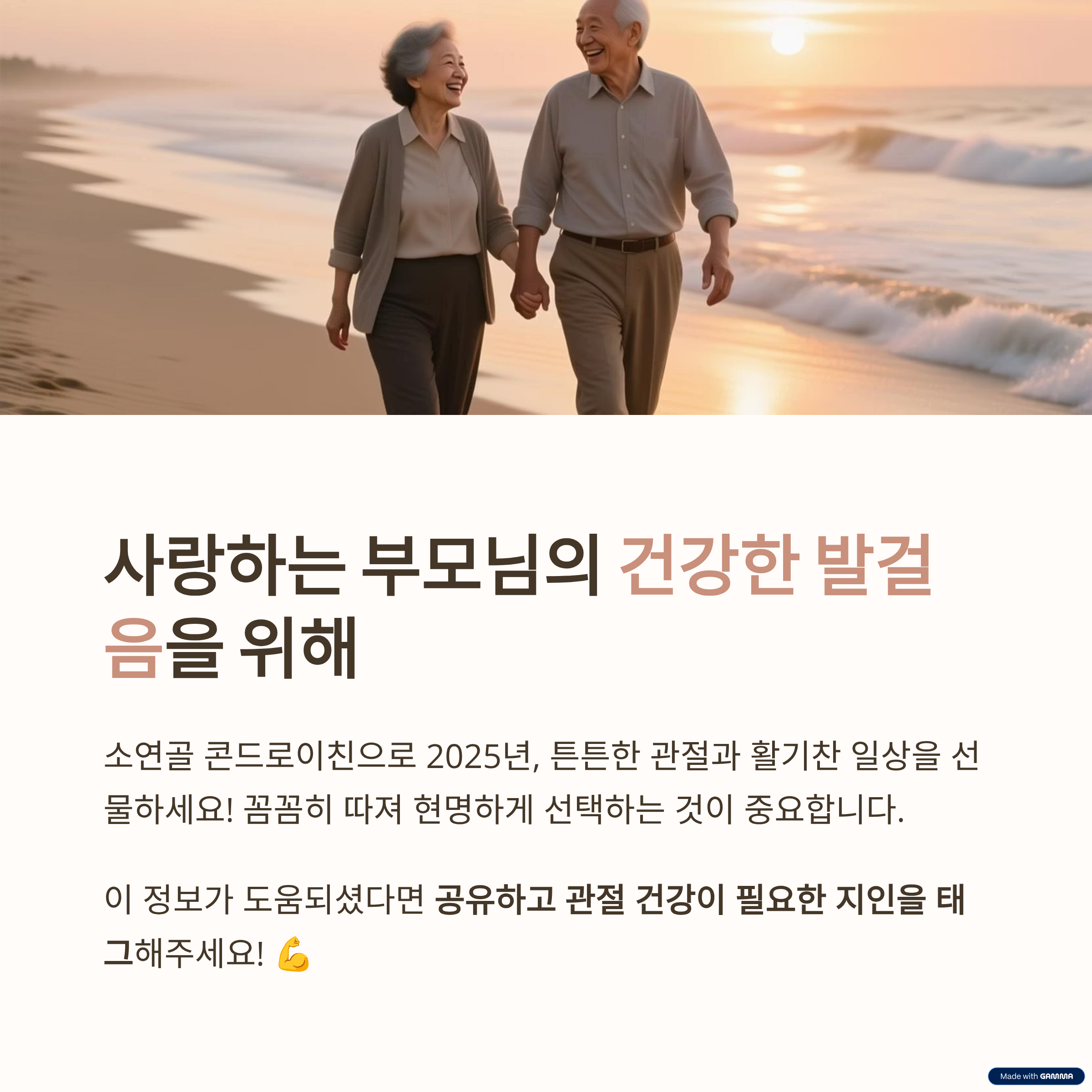 우리 부모님의 걷는 뒷모습, 건강한 발걸음은 모든 자녀의 바람일 것입니다. '소연골 콘드로이친'은 인체 연골 구성 성분과 유사하여 높은 흡수율을 기대할 수 있는 관절 영양제입니다. 저의 6개월간의 꼼꼼한 탐색과 부모님의 실제 체감 변화를 통해 소연골 콘드로이친의 효능을 확신하게 되었습니다. 물론, 부작용과 주의사항을 숙지하고 순도, 함량, 분자량 등을 꼼꼼히 따져 현명하게 선택하는 것이 중요합니다. 막연한 정보에 흔들리지 마시고, 신뢰할 수 있는 소연골 콘드로이친으로 사랑하는 부모님과 나의 관절 건강을 지키세요. 2025년, 튼튼한 관절로 활기찬 일상을 누리시길 응원합니다! 💪