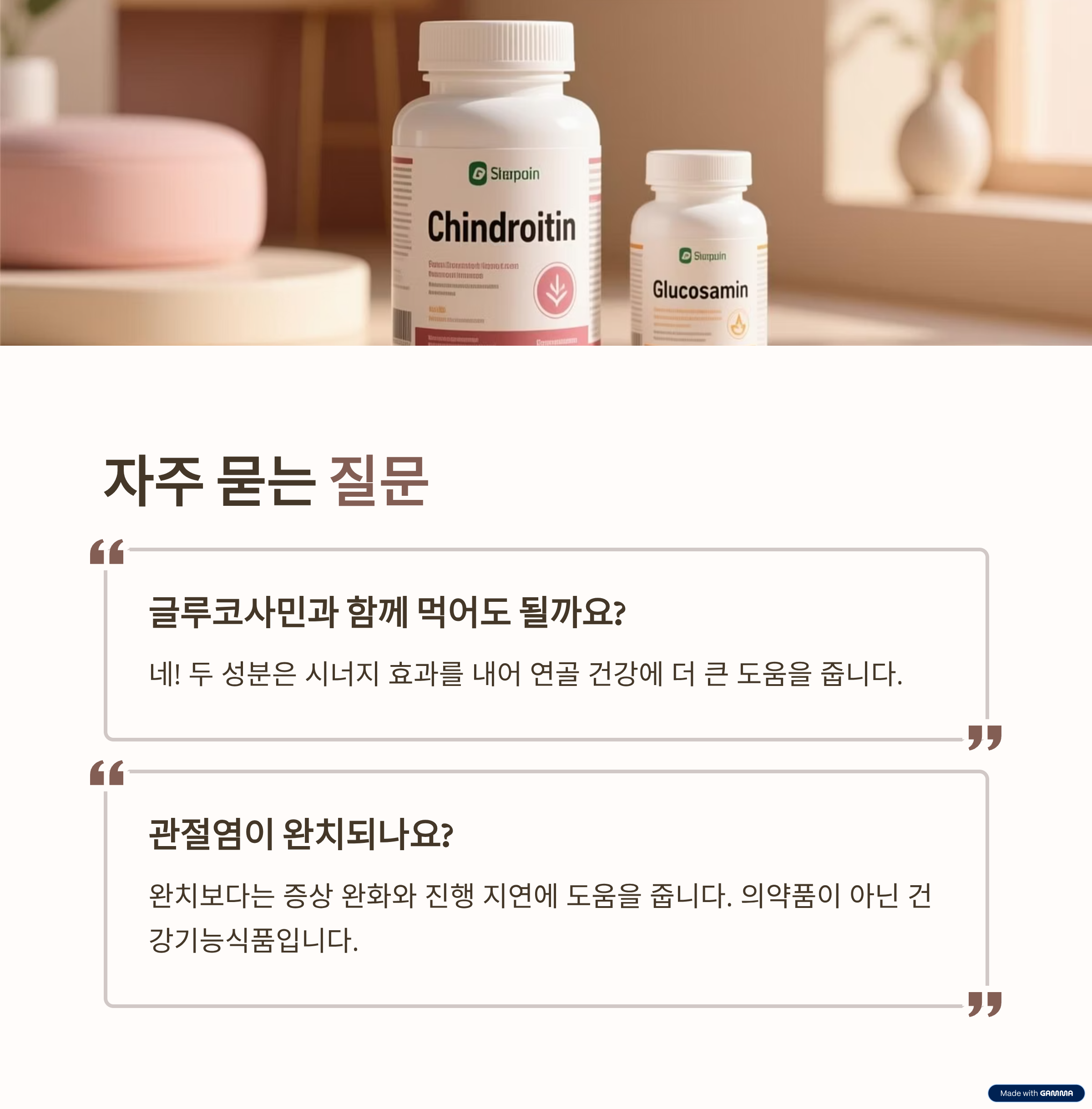 스니펫 노리기 블록: 콘드로이친과 글루코사민, 함께 먹어도 될까요? 콘드로이친과 글루코사민은 모두 관절 연골의 구성 성분입니다. 두 성분은 함께 복용했을 때 시너지 효과를 내어 연골 건강 및 관절 기능 개선에 더 큰 도움을 줄 수 있다고 알려져 있습니다. 글루코사민은 연골 세포가 콘드로이친과 다른 중요한 물질들을 만드는 데 필요한 '원료'를 제공하고, 콘드로이친은 연골의 탄성을 유지하고 충격 흡수 능력을 높이는 데 기여합니다. 따라서 관절 영양제로 함께 사용되는 경우가 많으며, 시중에는 이 두 가지 성분이 복합적으로 함유된 제품도 많습니다.