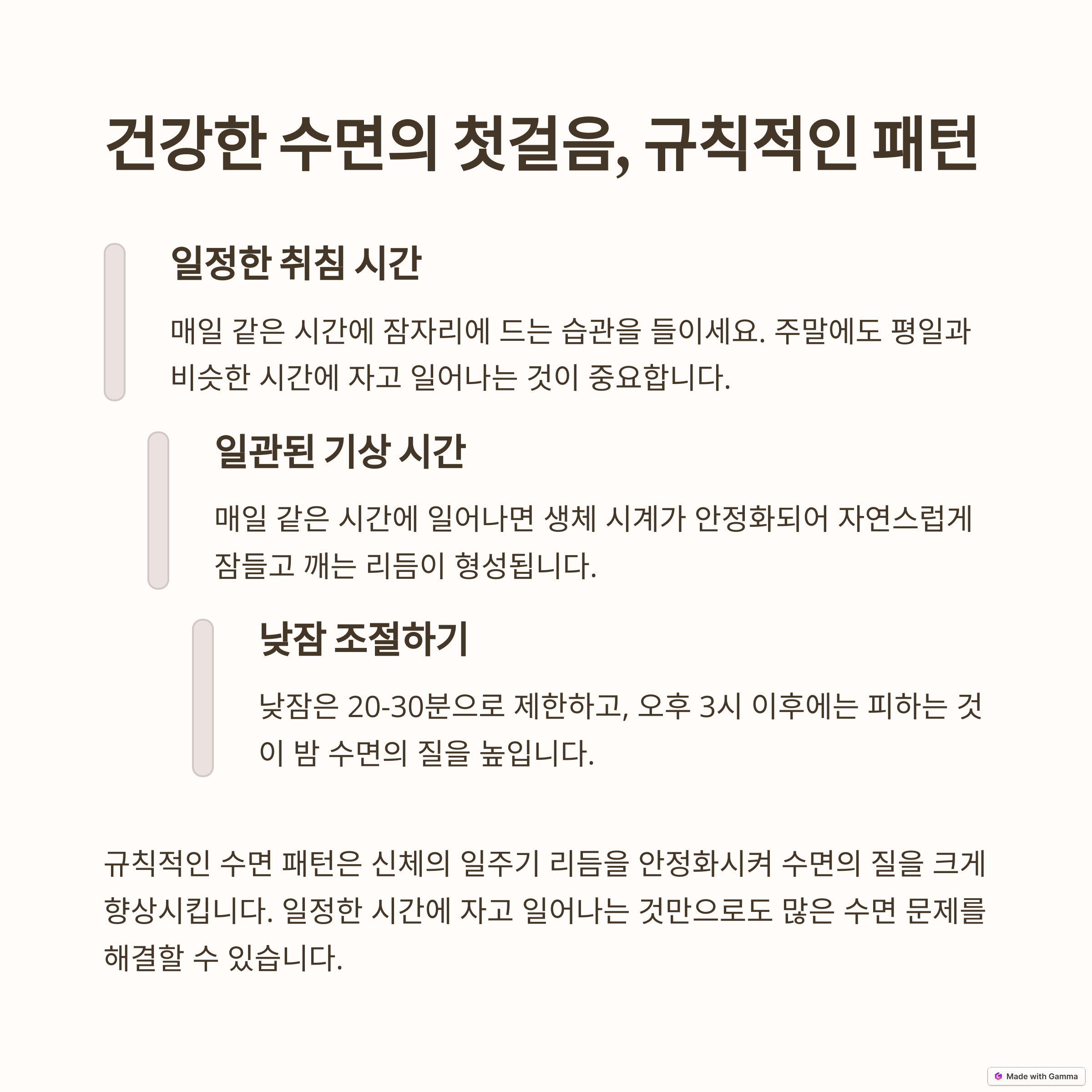 - 규칙적인 수면: 매일 일관된 시간에 자고 일어나도록 노력하세요.