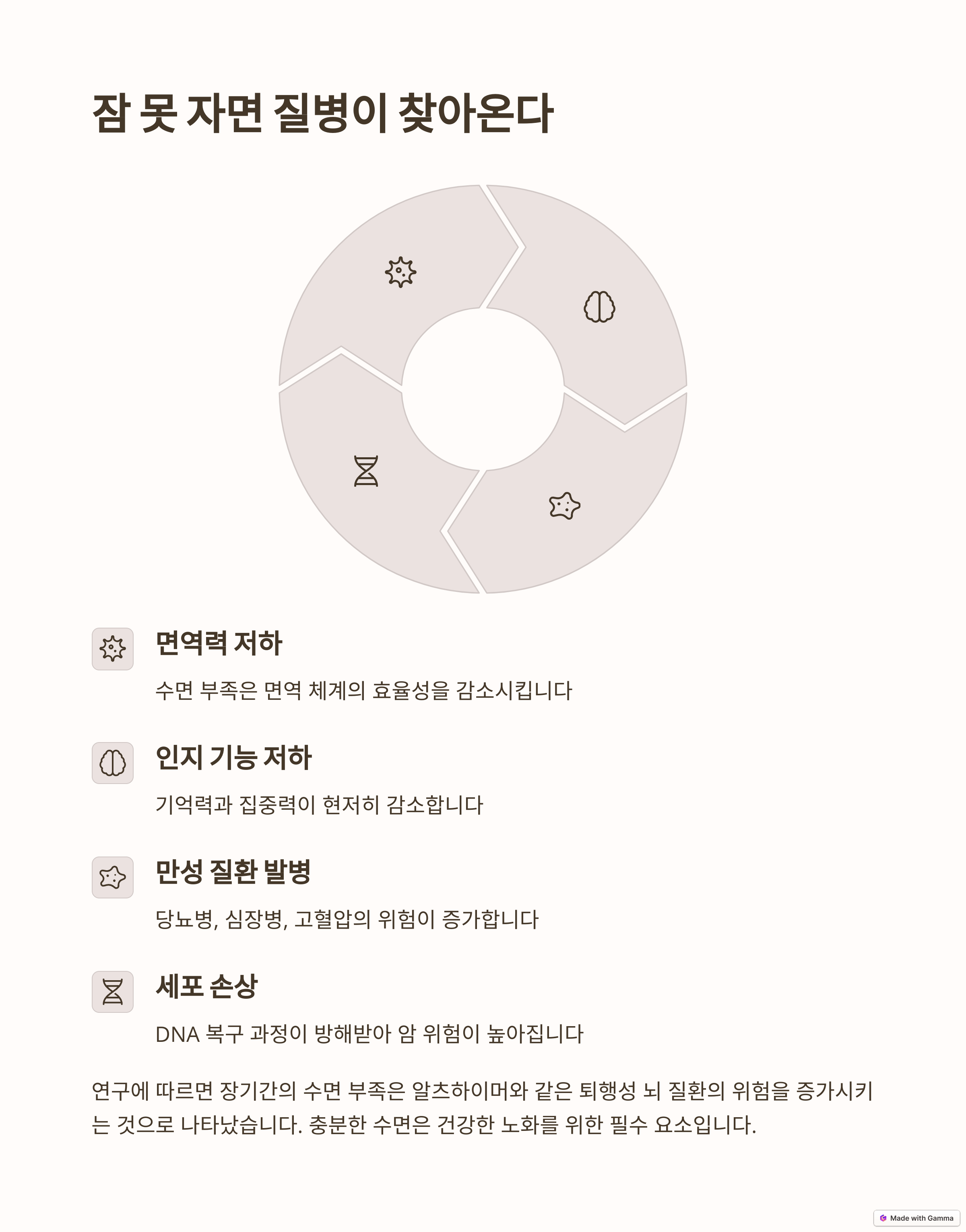 수면은 면역계를 회복하고 강화하는 시간이지만, 부족하면 면역력 저하로 다양한 질병에 더 쉽게 노출됩니다.