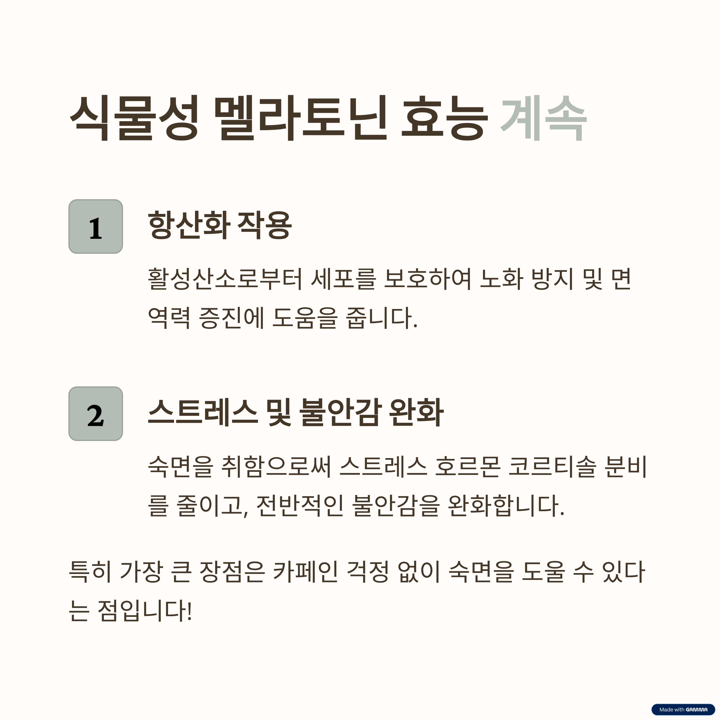 특히 가장 큰 장점은 카페인 걱정 없이 숙면을 도울 수 있다는 점입니다. 불면증으로 인해 진통제나 카페인 음료에 의존하던 분들에게 식물성 멜라토닌은 좋은 대안이 될 수 있습니다.