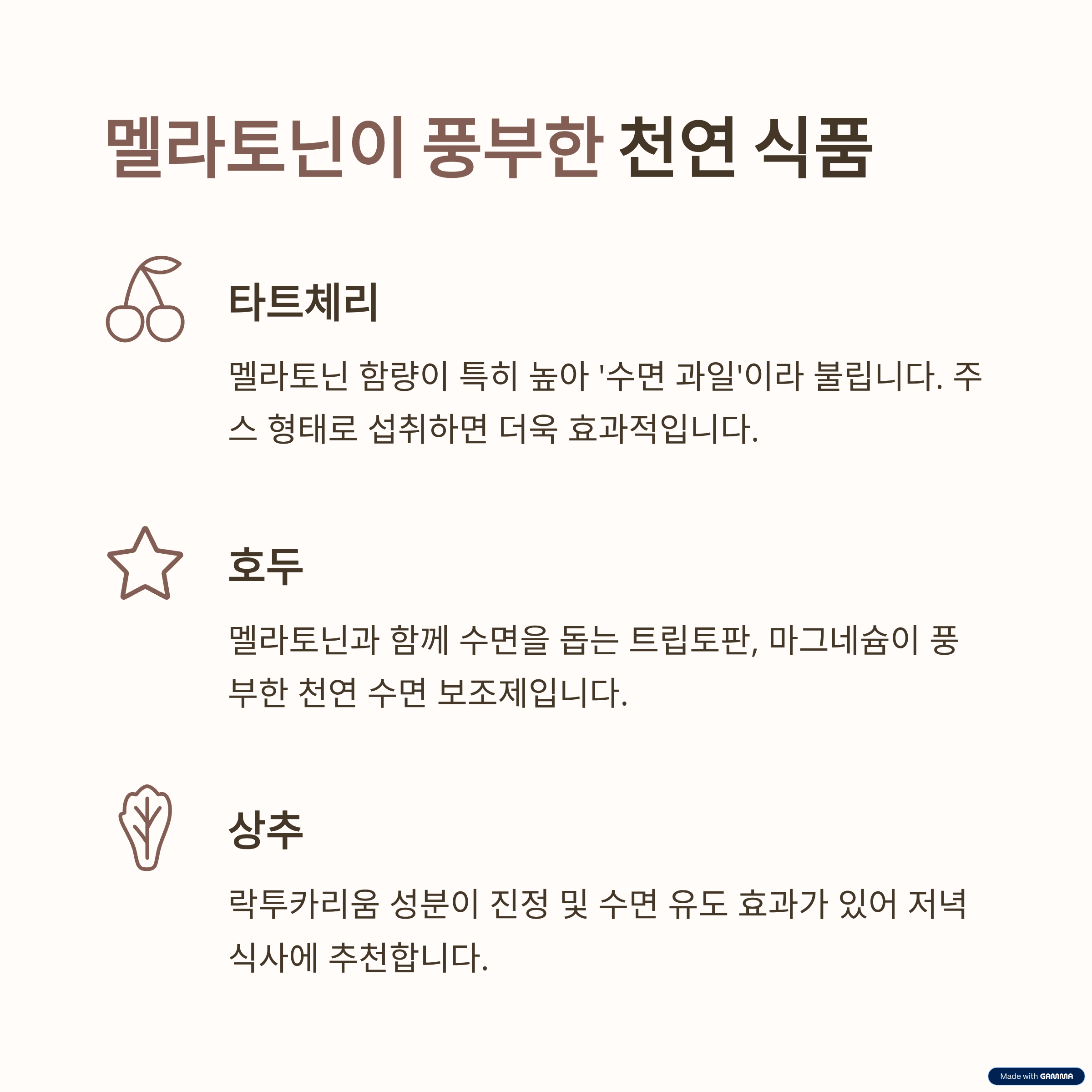 - 저는 3개월간 식물성 멜라토닌이 풍부한 음식 섭취와 보조제를 병행하며 밤잠을 설치던 고통에서 벗어나 꿀잠을 자는 기적을 경험했습니다.