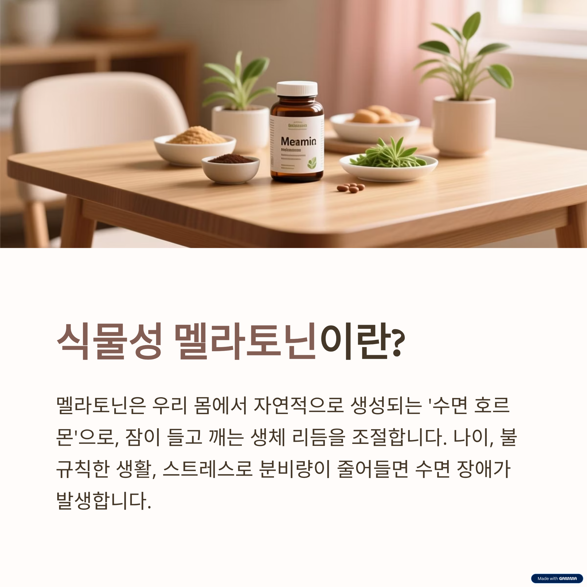 - 식물성 멜라토닌은 식물에서 추출된 수면 호르몬으로, 자연스럽게 수면을 유도하고 수면의 질을 개선하는 데 도움을 줍니다.
