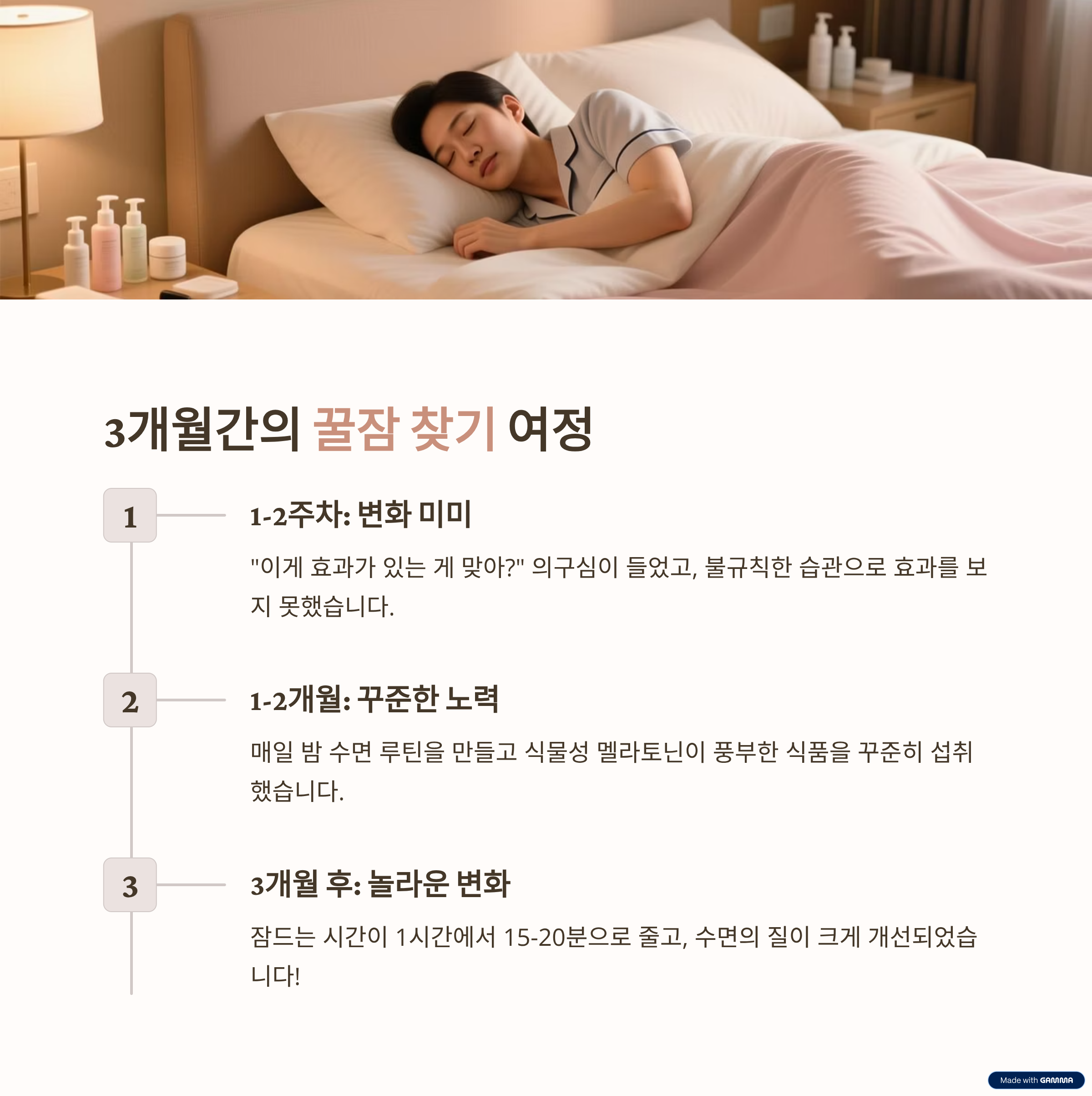 처음 1~2주간은 큰 변화가 없었습니다. 오히려 "이게 효과가 있는 게 맞아?" 하는 의구심이 들었죠. 가끔은 식단 관리를 소홀히 하고 야식을 먹거나, 잠들기 직전까지 스마트폰을 붙잡고 있는 등 불규칙한 수면 습관을 버리지 못해 오히려 효과를 제대로 보지 못하는 시행착오도 겪었습니다. "멜라토닌 주스만 마시면 잠이 올 거야!"라는 막연한 기대가 컸기 때문에 실망도 컸습니다. 하지만 '꾸준함이 답이다'라는 생각으로 3개월 동안 매일 밤 수면 루틴을 만들고 식물성 멜라토닌이 풍부한 식품들을 꾸준히 섭취했습니다.