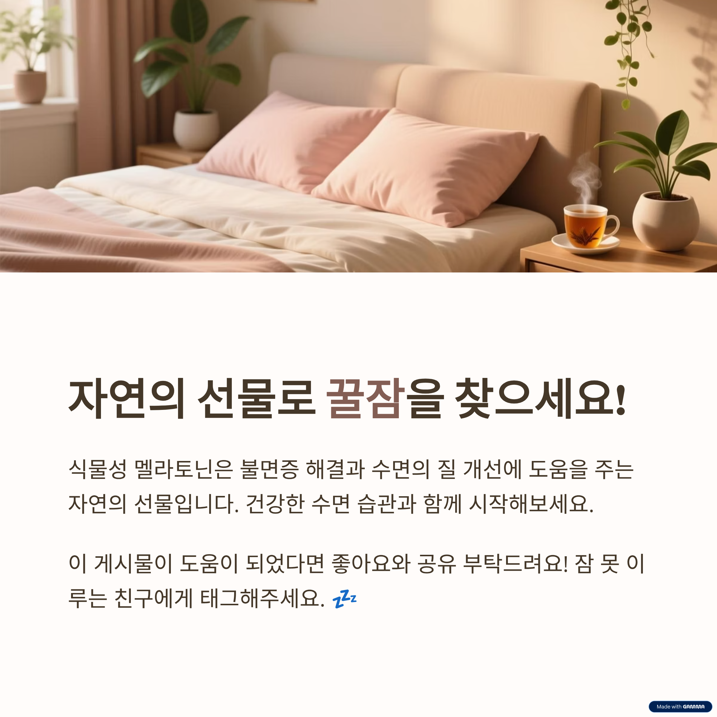 - 꾸준함과 규칙적인 습관: 식물성 멜라토닌은 약이 아닌 보조제입니다. 보조제 섭취와 함께 규칙적인 수면 습관(매일 같은 시간에 잠들고 일어나기, 잠들기 전 스마트폰/TV 피하기 등)을 병행해야 효과를 극대화할 수 있습니다.