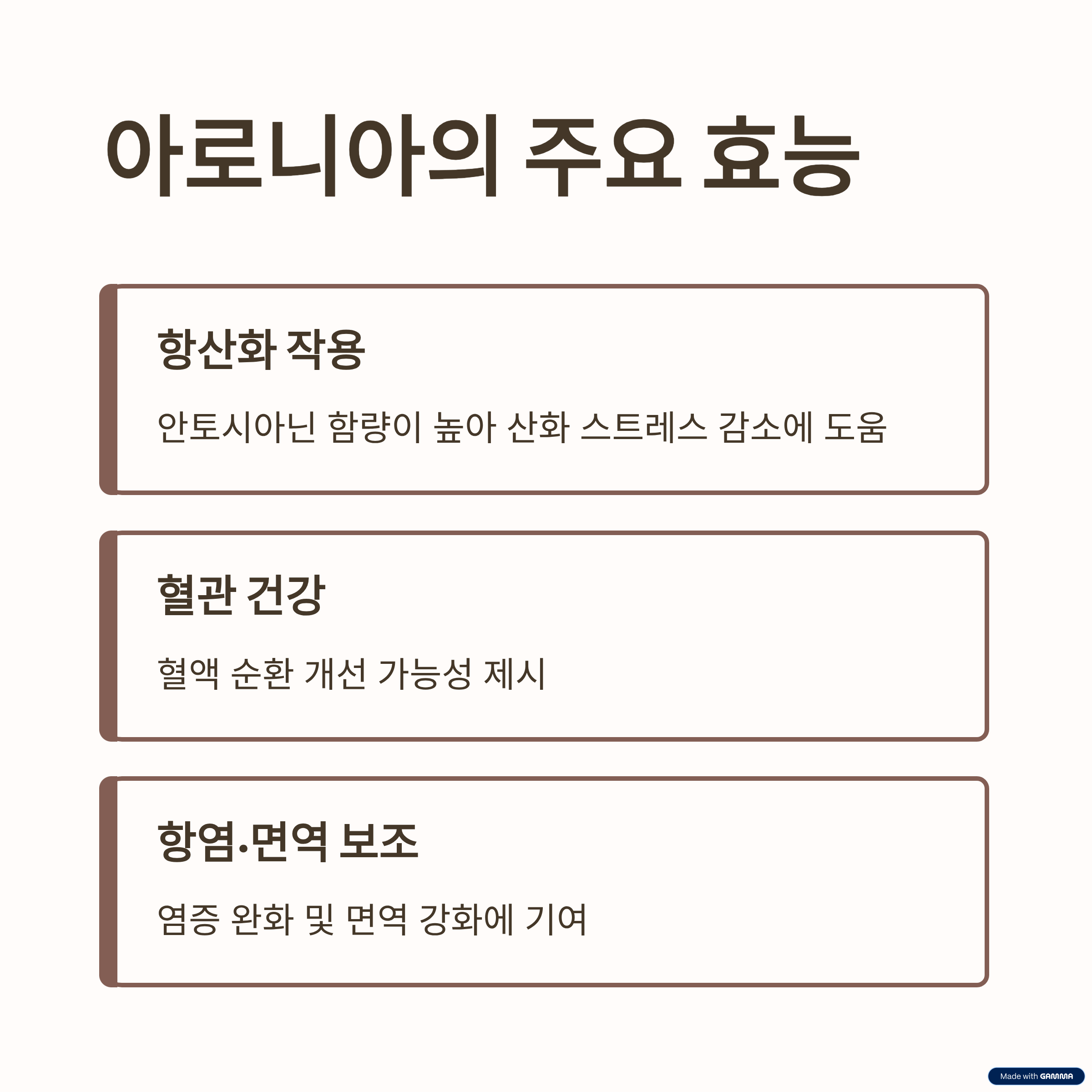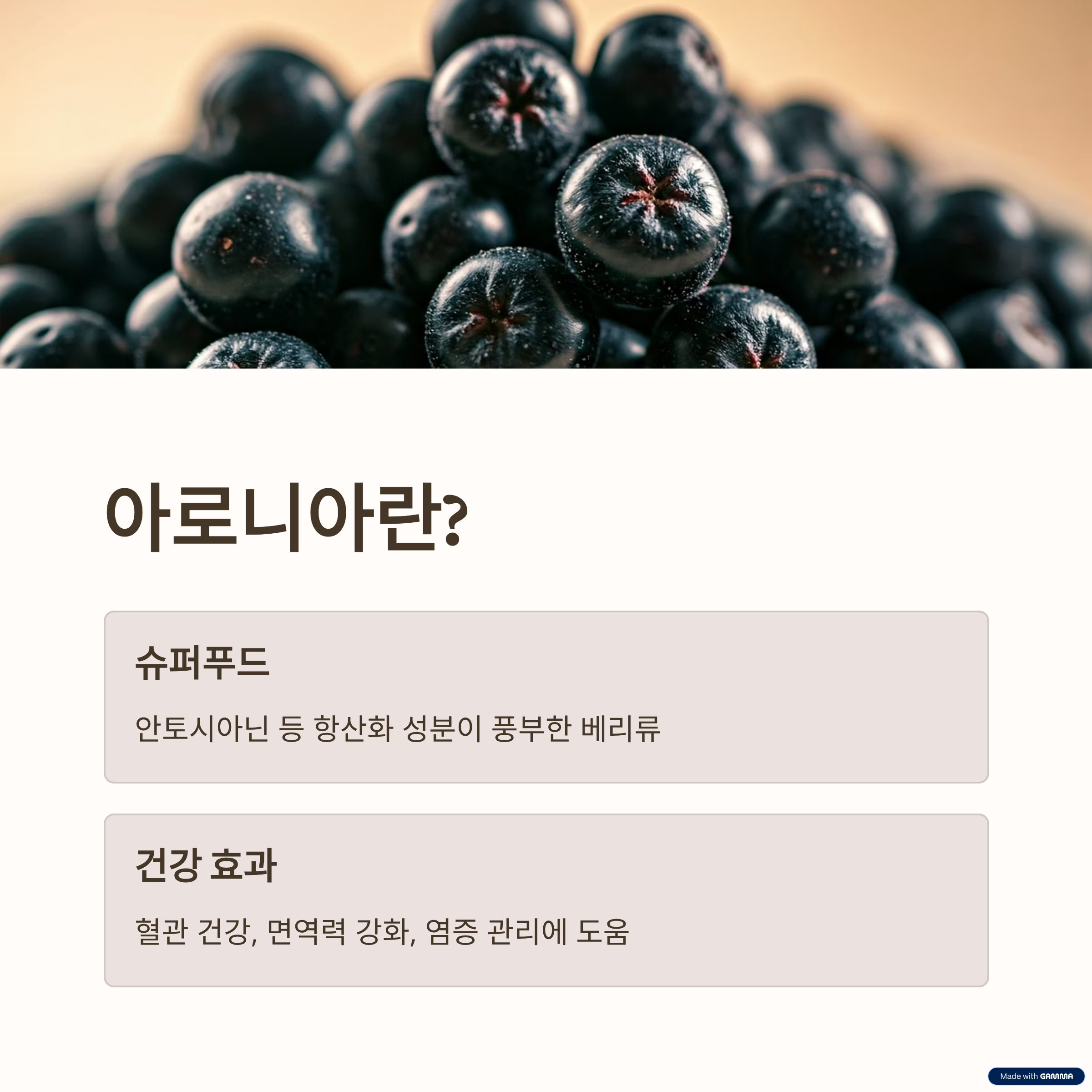 - 아로니아는 안토시아닌 중심의 항산화 과일로 산화 스트레스 완화에 도움 가능.