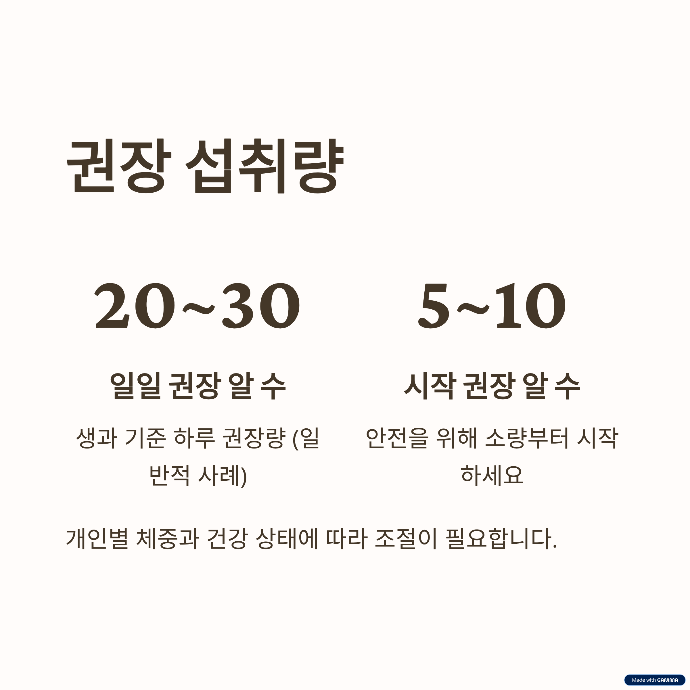 일반 권장 사례로 생과 기준 하루 20~30알이 소개되기도 하지만, 개인 상태를 고려해 5~10알로 시작해 반응을 보는 것을 권합니다.