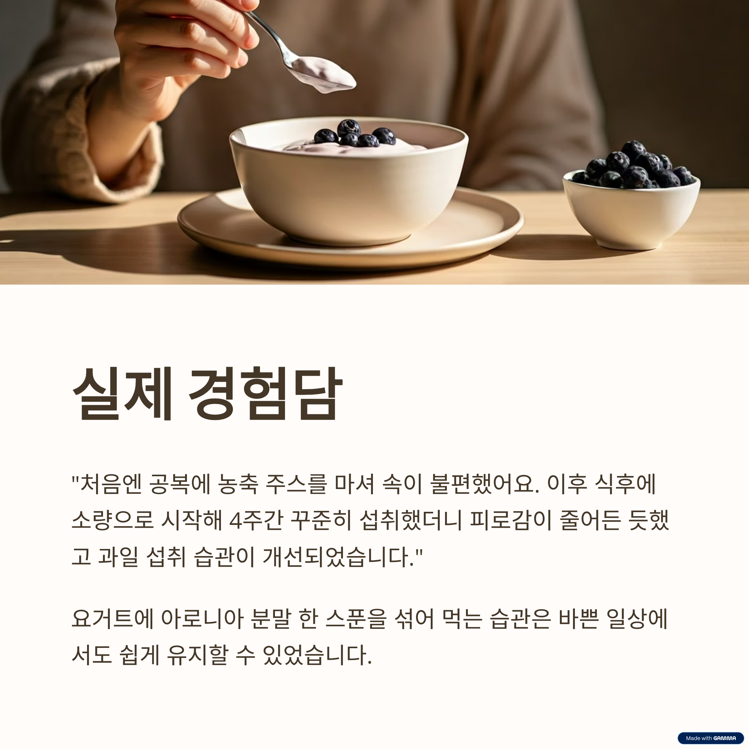 시행착오: 초기에는 공복에 농축 주스를 마셔 속이 불편했고, 한 번은 분말 제품을 과하게 넣어 소화 불편을 경험했습니다.