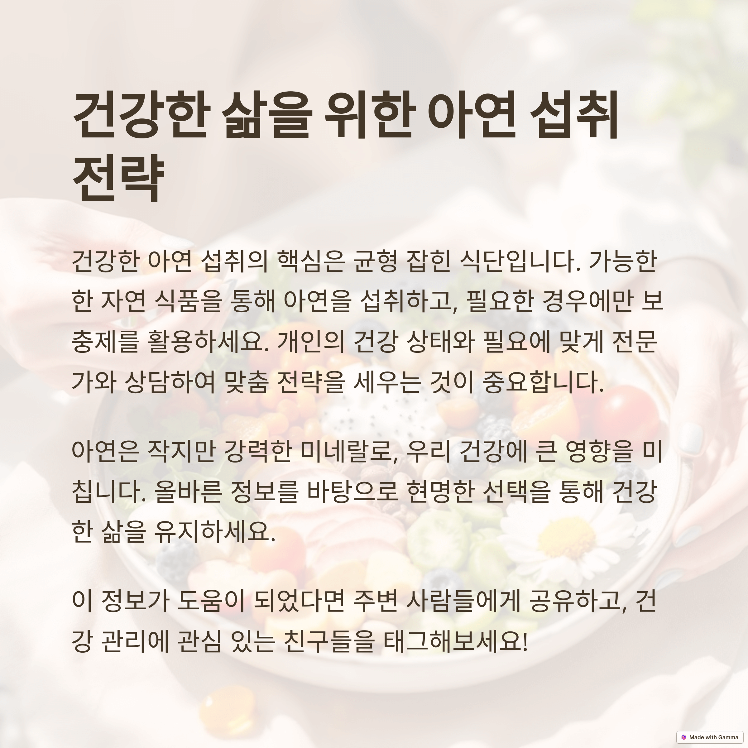 - 적정량 섭취: 아연 보충제를 복용할 경우, 제품에 표시된 섭취량을 지켜야 합니다. 1일 아연 상한 섭취량은 40mg입니다. 과다 섭취는 철분 흡수를 방해하고 면역 기능을 저하시킬 수 있습니다.