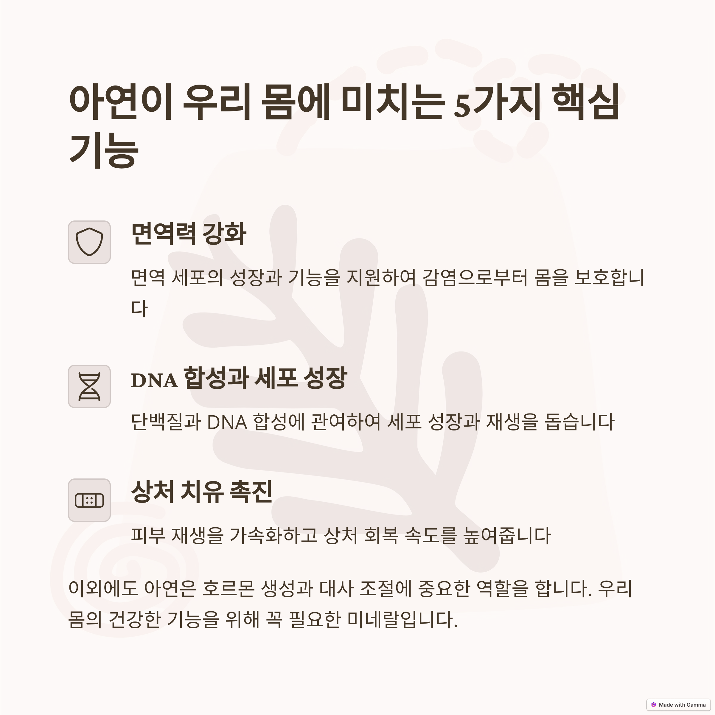 아연은 우리 몸의 다양한 생리 기능에 필수적인 미네랄입니다. DNA 합성, 면역 기능 강화, 상처 치유, 세포 성장 등 여러 과정에 관여하며, 건강을 유지하는 데 중요한 역할을 합니다. 면역력 강화는 물론 성장 발달, 피부 건강, 남성 건강 등 다양한 측면에서 긍정적인 영향을 미칩니다.
