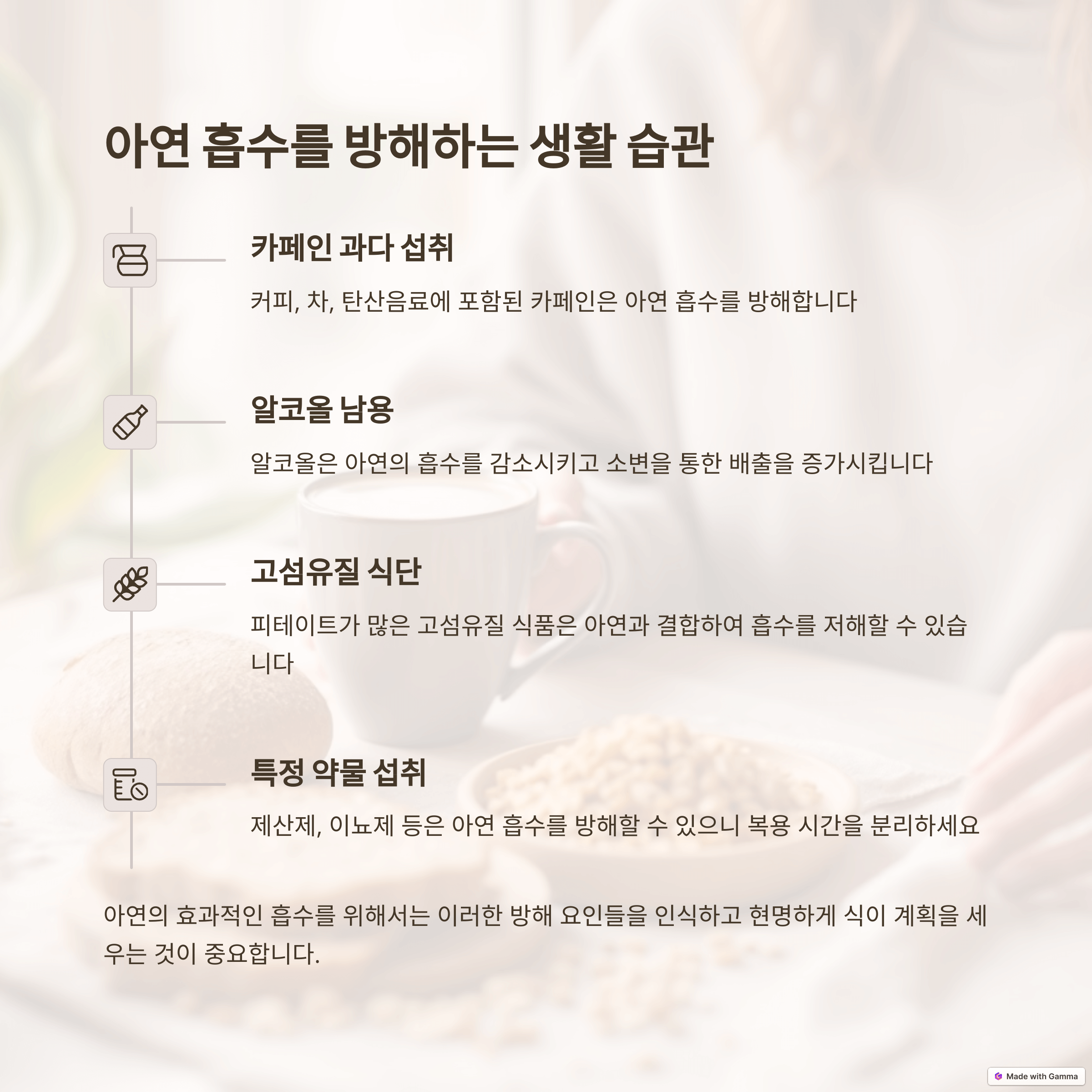 - 약물 복용: 특정 약물(이뇨제, 제산제, 항생제 등)은 아연 흡수를 방해할 수 있습니다. 이뇨제는 아연 배설을 증가시키고, 제산제는 위산 분비를 억제하여 흡수를 방해하며, 항생제는 아연과 결합하여 흡수를 저해할 수 있습니다. 이러한 약물을 복용 중인 경우, 아연 섭취량을 늘리거나 보충제 복용을 고려해볼 수 있습니다.