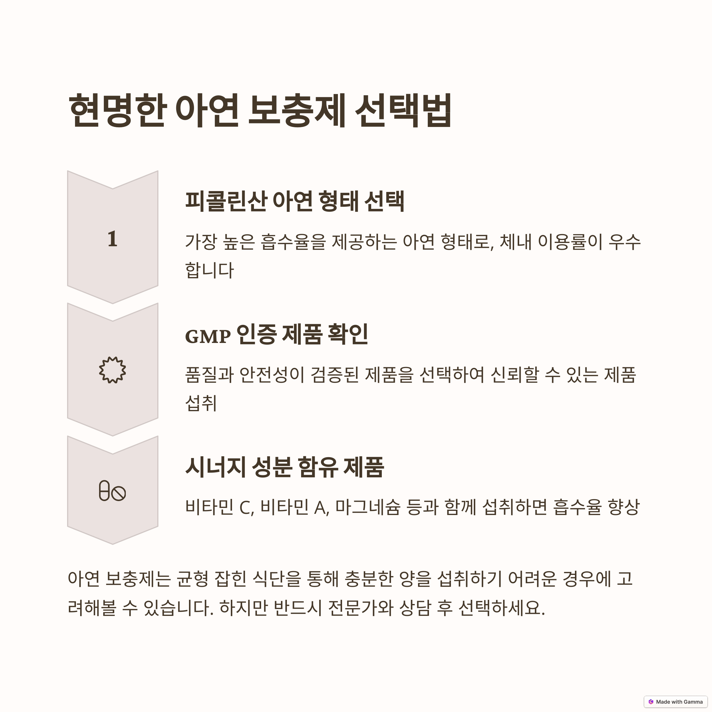 - 아연 보충제 선택 가이드: 글루콘산 아연, 황산 아연, 피콜린산 아연 등 다양한 형태가 있습니다. 흡수율, 가격, 부작용 등을 고려하여 적절한 제품을 선택해야 합니다. 일반적으로 피콜린산 아연이 흡수율이 가장 높다고 알려져 있습니다. 참고 자료를 확인하여 자신에게 맞는 제품을 선택하세요. 제품의 성분 표시를 꼼꼼히 확인하고, 불필요한 첨가물이 들어있지 않은 것을 고르는 것이 좋습니다. GMP(Good Manufacturing Practice) 인증을 받은 제품을 선택하여 품질과 안전성을 확보하는 것도 중요합니다. 아연 보충제는 공복보다 식사 직후에 섭취하는 것이 위장 장애를 줄이는 데 도움이 됩니다.