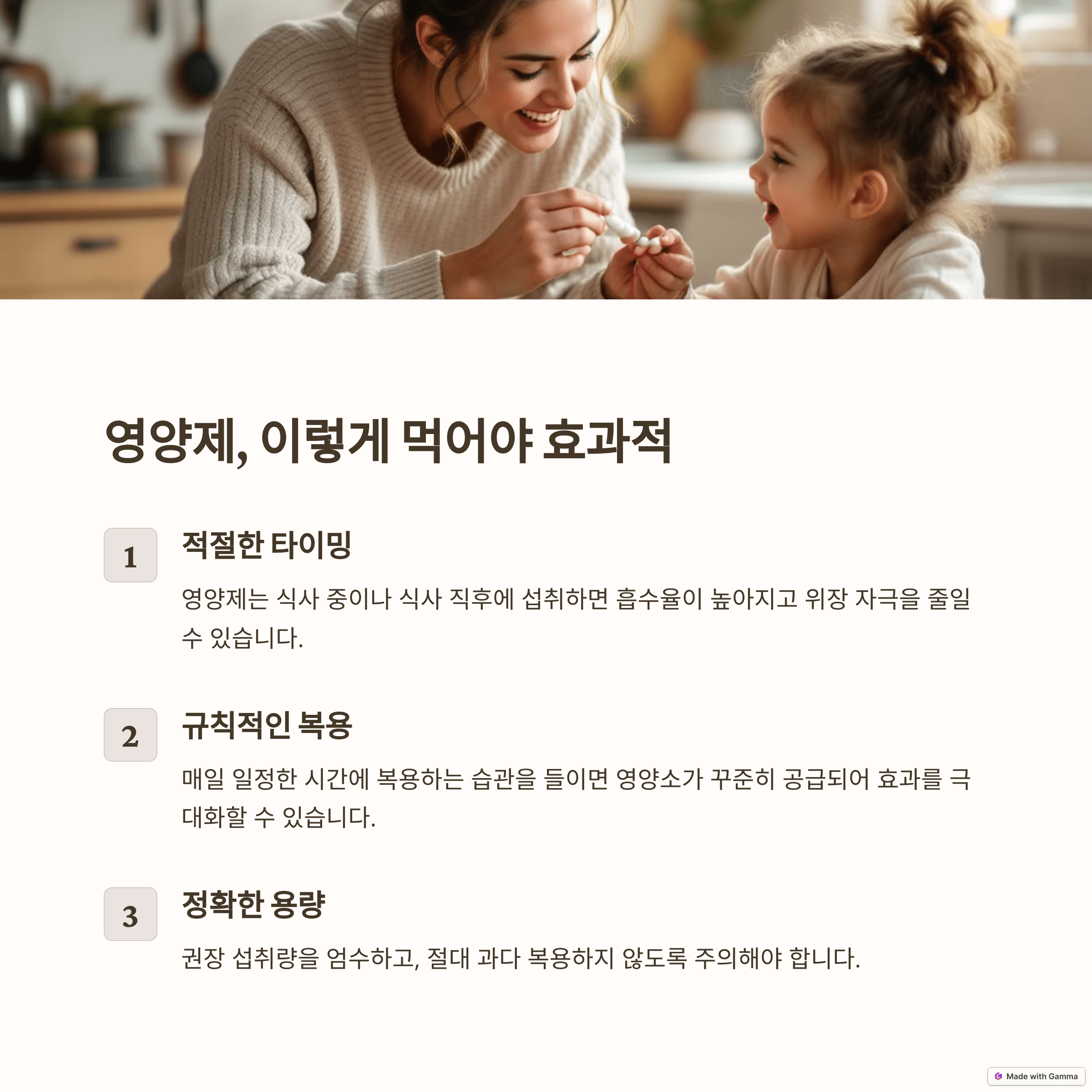 영양제는 아이의 성장과 건강에 도움을 줄 수 있지만, 섭취 시 주의사항을 지키지 않으면 오히려 부작용을 일으킬 수 있습니다. 다음은 영양제 섭취 시 주의사항 및 부작용 예방 가이드입니다.