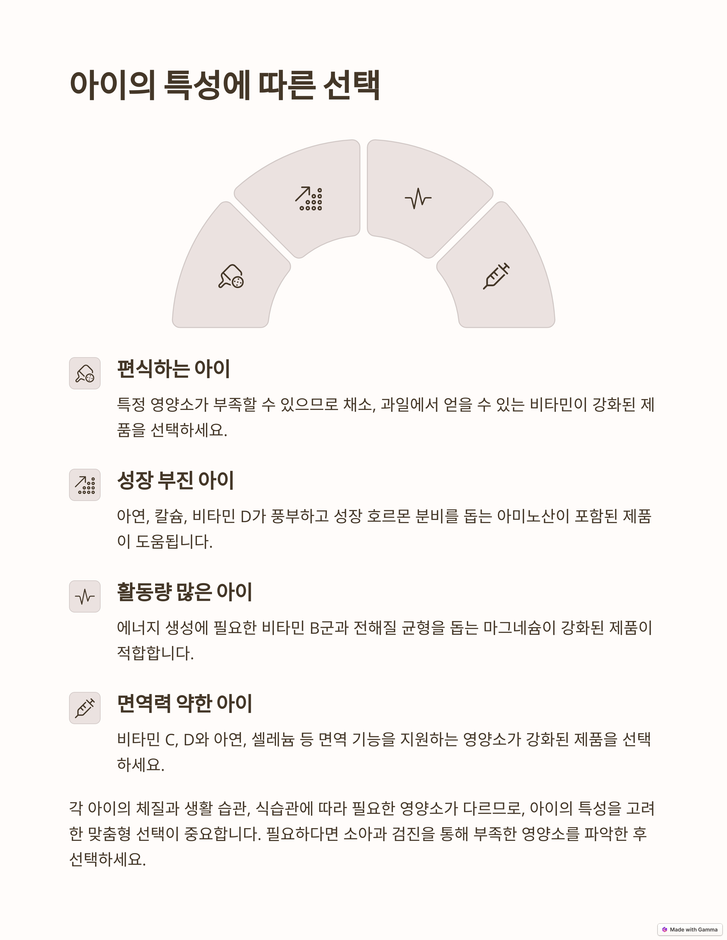 사랑하는 우리 아이가 건강하게 자라나는 모습을 보는 것은 모든 부모의 가장 큰 행복일 것입니다. 아이들은 쑥쑥 자라면서 다양한 활동을 통해 에너지를 소비하고, 뼈와 근육, 두뇌 등 신체 각 부분이 빠르게 발달합니다. 이러한 성장 과정에서 필요한 영양소는 성인보다 훨씬 많고 다양합니다. 균형 잡힌 식단을 통해 필요한 영양소를 충분히 섭취하는 것이 가장 이상적이지만, 현실적으로 아이들은 편식을 하거나 식사량이 부족한 경우가 많아 영양 불균형이 발생하기 쉽습니다.
