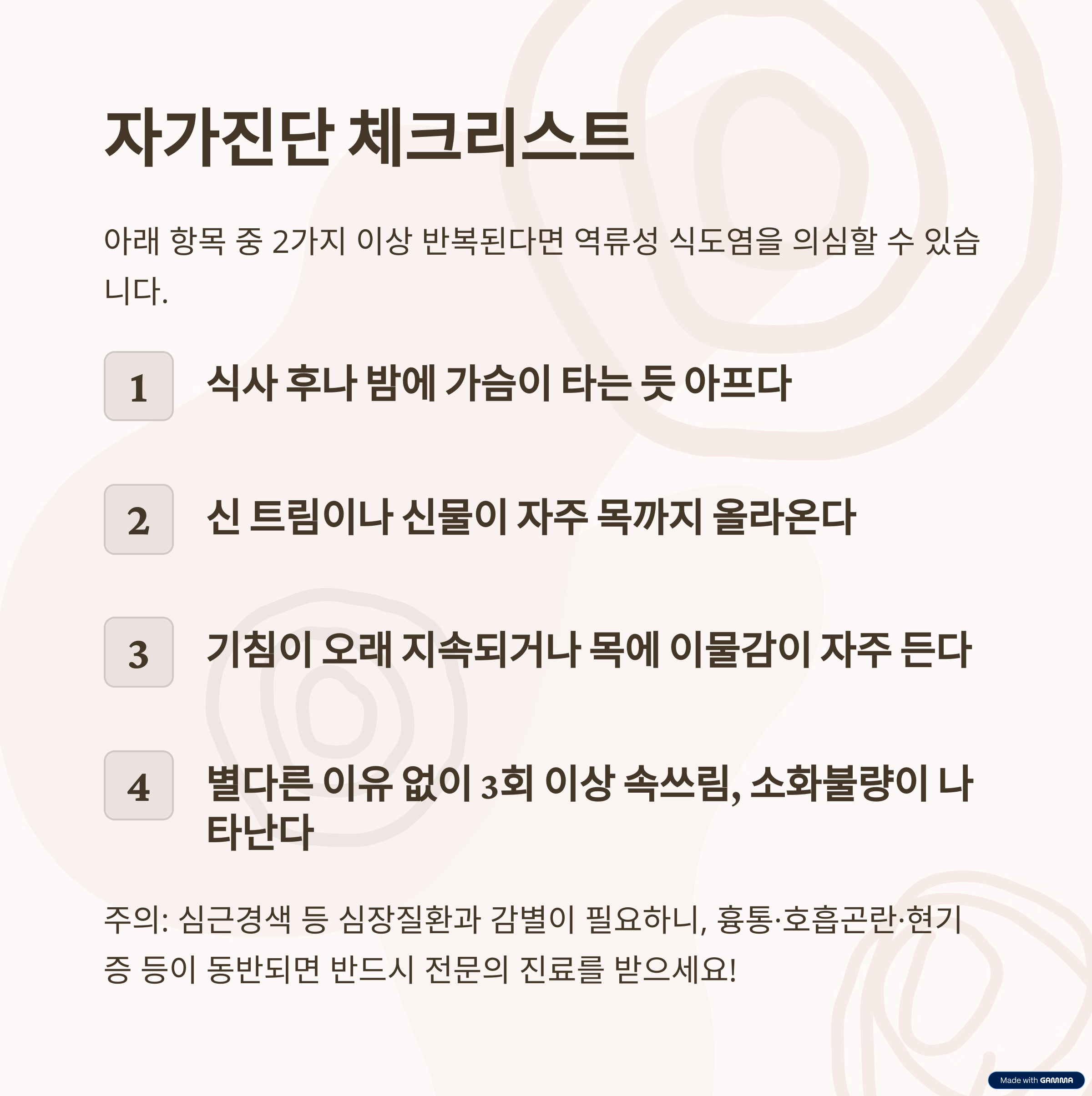 아래 항목 중 2가지 이상 반복된다면 역류성 식도염을 의심할 수 있습니다.