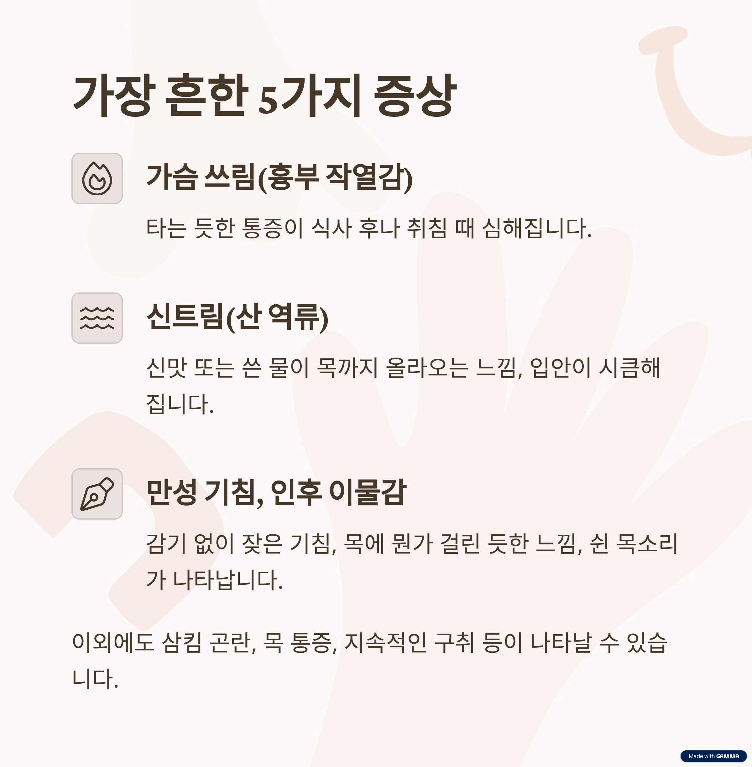- 가슴 쓰림(흉부 작열감): 타는 듯한 통증이 식사 후나 취침 때 심해집니다.