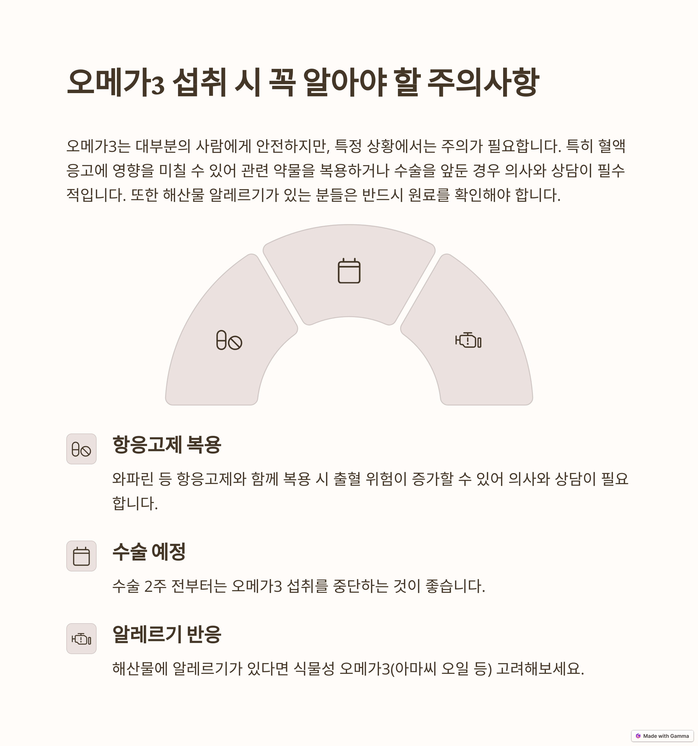 - 수술 예정: 수술 예정인 경우, 수술 1~2주 전부터 오메가3 섭취를 중단하는 것이 좋습니다. 오메가3가 혈액 응고를 억제하여 출혈 위험을 높일 수 있기 때문입니다.