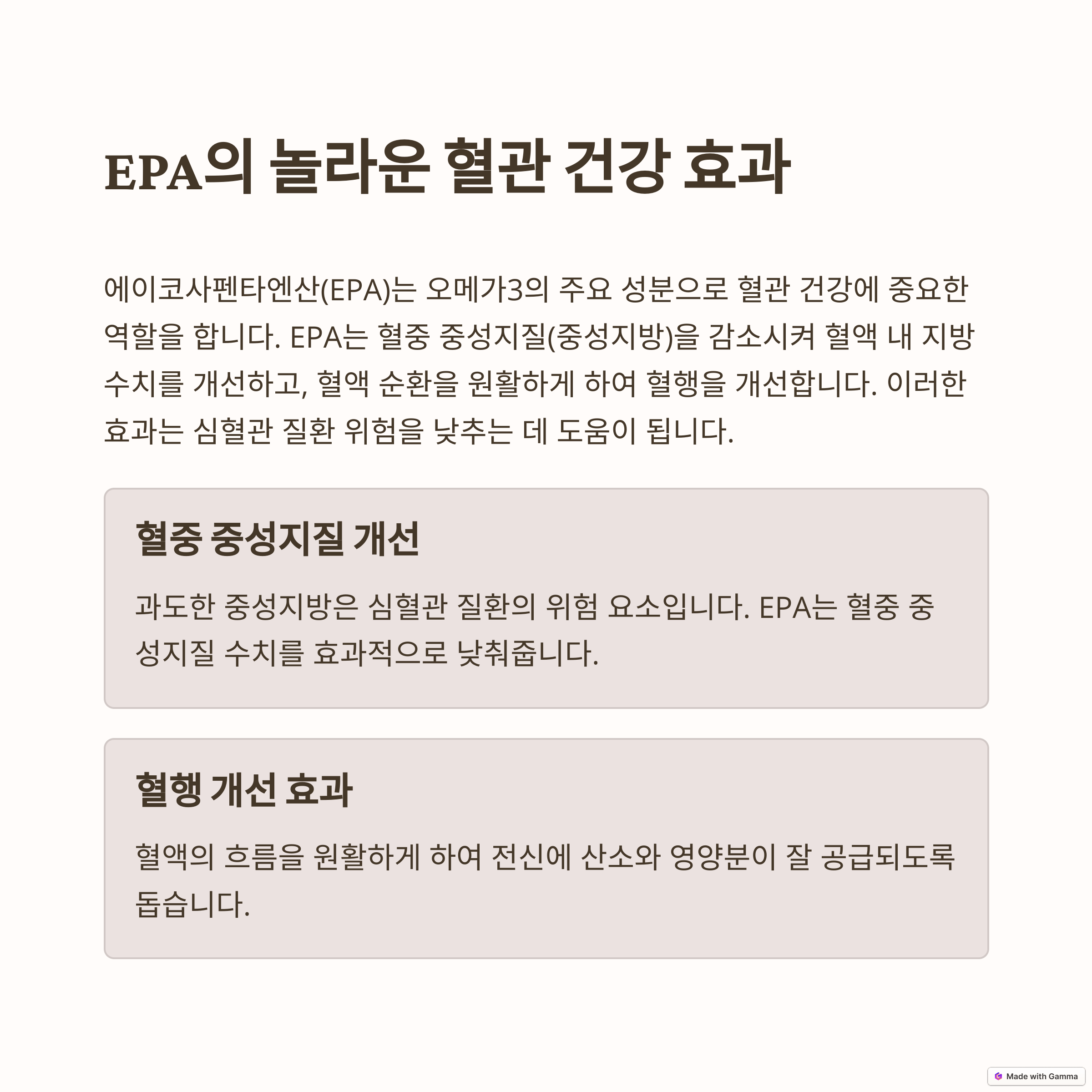 - EPA (Eicosapentaenoic acid): EPA는 혈중 중성지질 수치를 낮추고, 혈액 응고를 억제하여 혈행 개선에 도움을 줄 수 있습니다. 또한, 염증을 줄이는 효과가 있어 심혈관 질환 예방에도 도움이 됩니다.