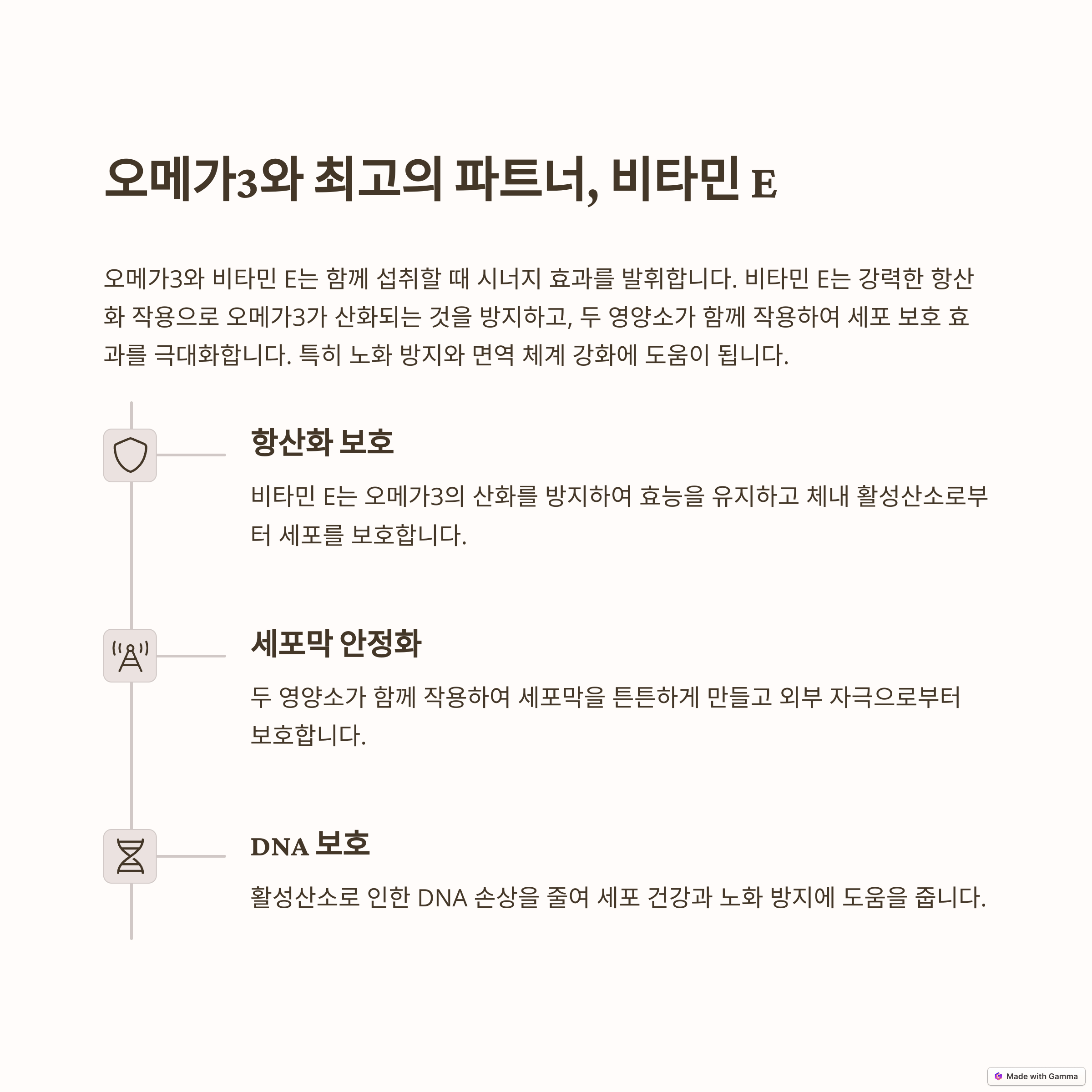 - 비타민 E: 비타민 E는 항산화 작용을 통해 오메가3의 산패를 막아주고, 오메가3의 효능을 높여줍니다.
