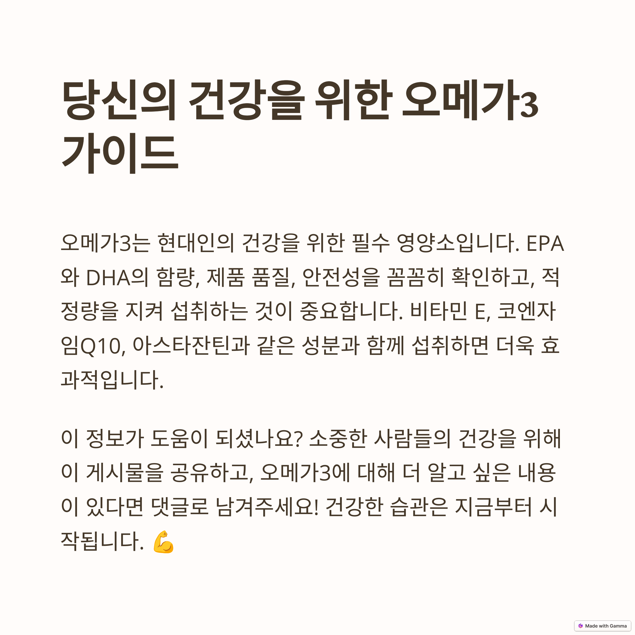 오메가3는 건강에 도움을 줄 수 있는 유용한 영양소이지만, 개인의 건강 상태와 필요에 따라 적절하게 섭취하는 것이 중요합니다. 전문가와 상담하여 자신에게 맞는 오메가3 제품을 선택하고, 올바른 방법으로 섭취하여 더욱 건강한 삶을 누리시길 바랍니다.
