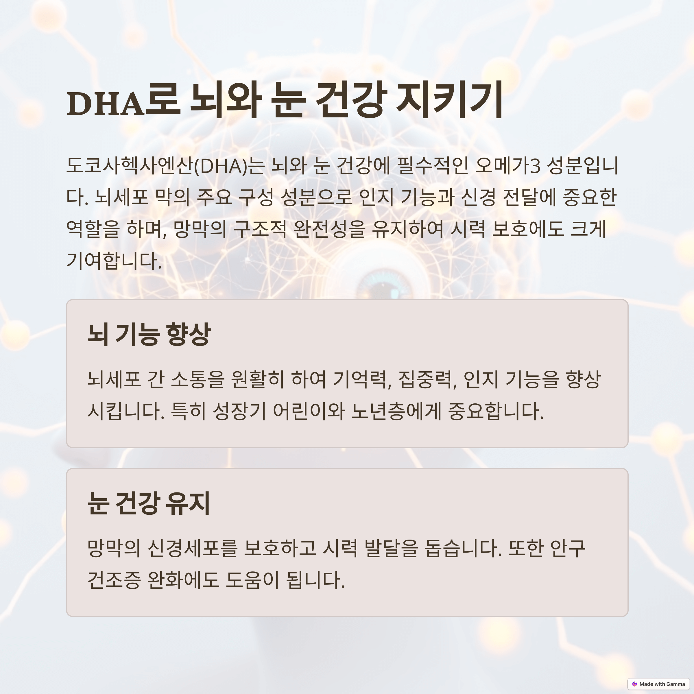 - DHA (Docosahexaenoic acid): DHA는 뇌와 신경 조직, 망막의 주요 구성 성분으로, 뇌 기능 개선, 기억력 향상, 학습 능력 향상에 도움을 줄 수 있습니다. 특히, 임산부와 수유부의 경우 DHA 섭취는 태아와 영아의 두뇌 발달에 중요한 영향을 미칩니다. 또한, DHA는 눈 건강에도 도움을 주어 시력 유지 및 개선에 효과적입니다.