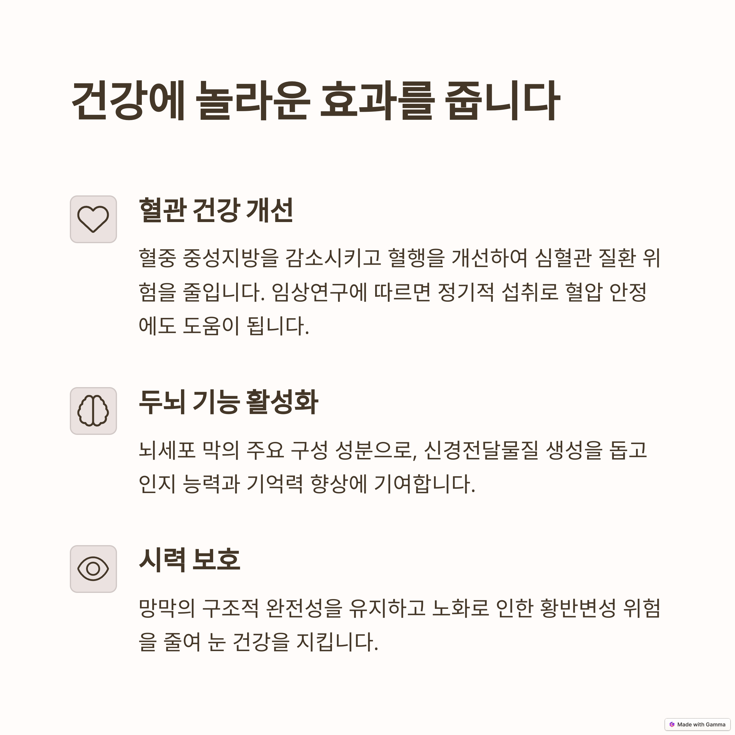 | 두뇌 발달 및 기능 개선 | 뇌 기능 활성화, 기억력 개선, 학습 능력 향상, 태아 두뇌 발달, 뇌 신경 세포막 유연성 증가, 인지 기능 향상 |