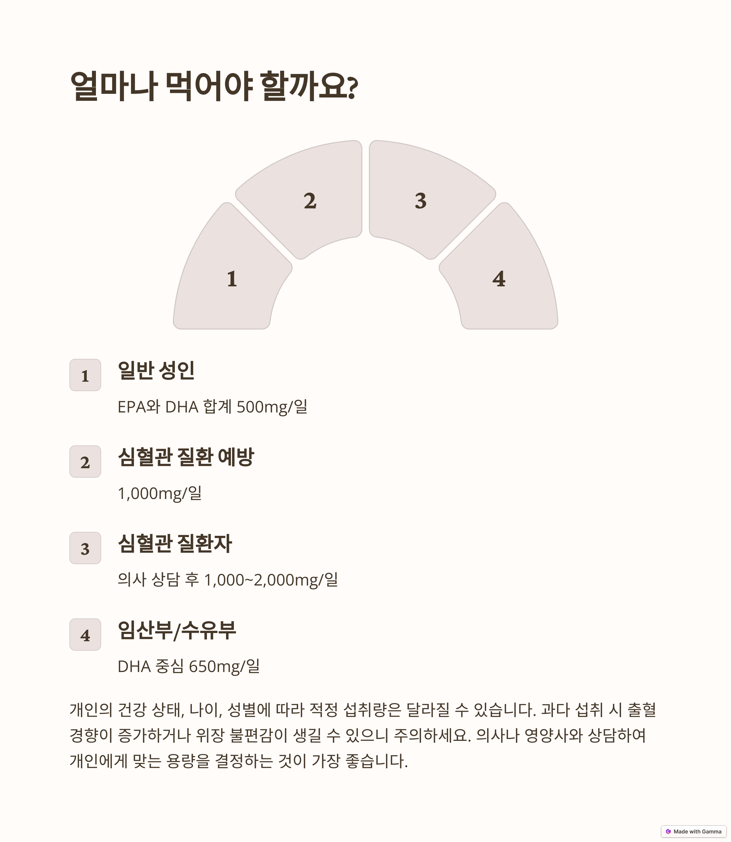 - EPA와 DHA 함량 확인: 제품 라벨에서 EPA와 DHA 함량을 확인하고, 하루 권장 섭취량을 충족하는 제품을 선택합니다.