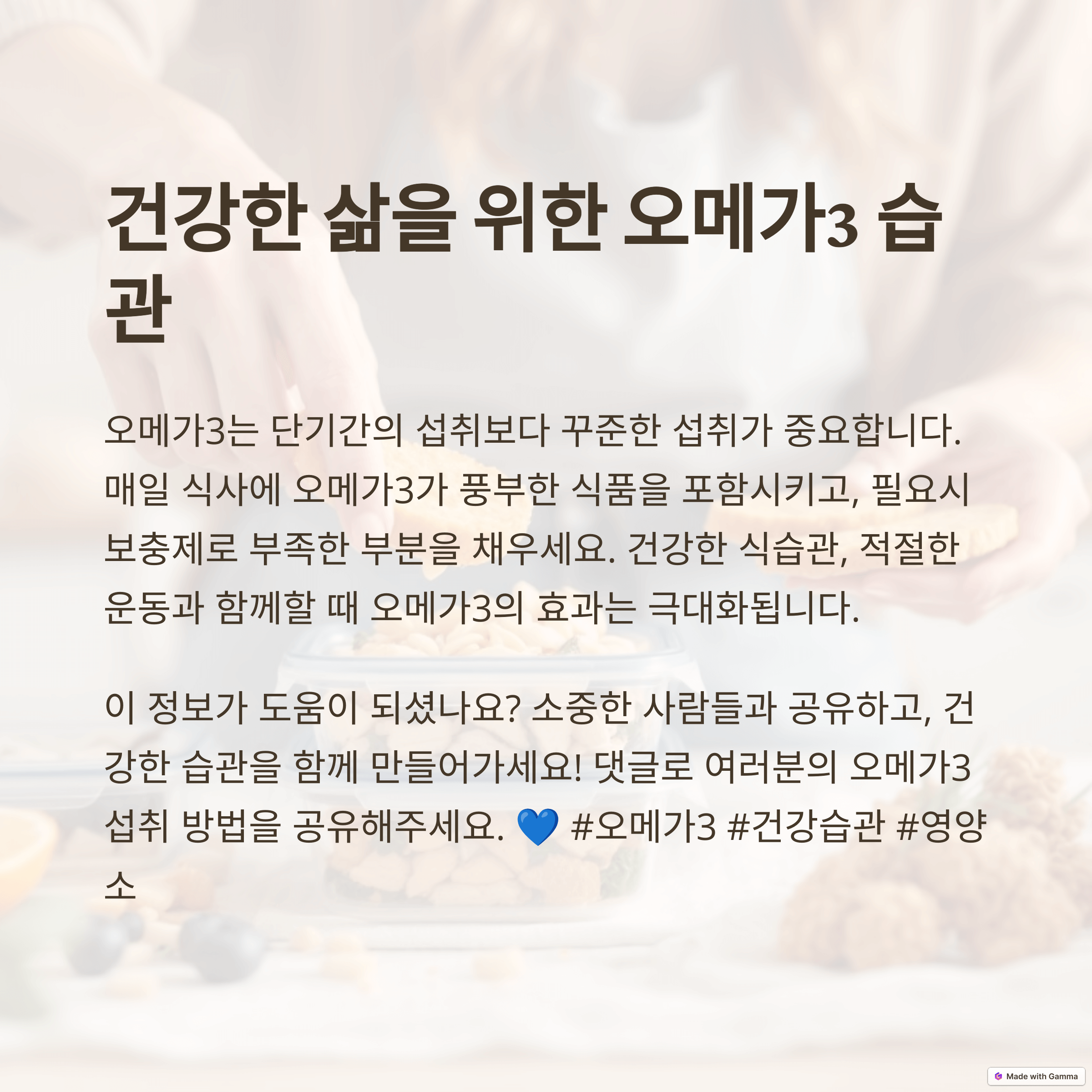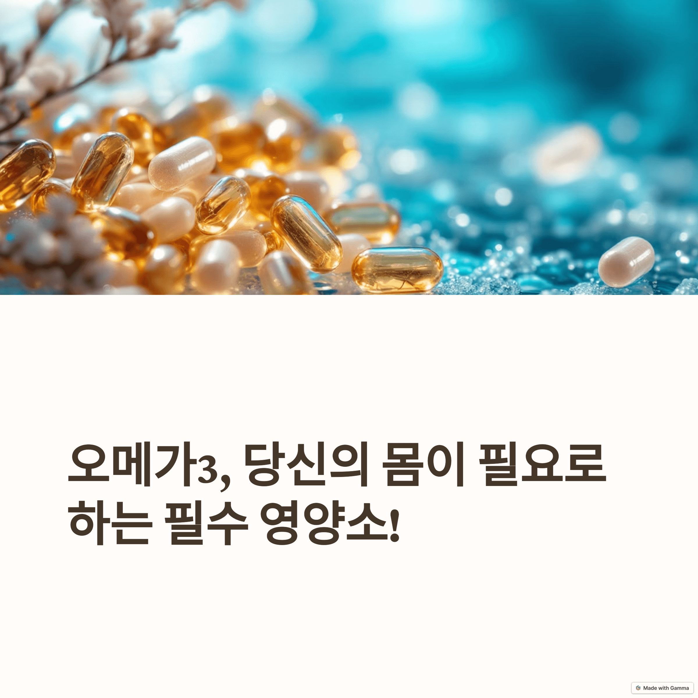 "혹시 혈관 건강과 뇌 건강, 모두 챙기고 싶으신가요? 오메가3가 그 해답이 될 수 있습니다! 지금부터 오메가3의 놀라운 효능과 올바른 섭취 방법을 알아보고, 건강한 삶을 위한 비법을 찾아보세요!"