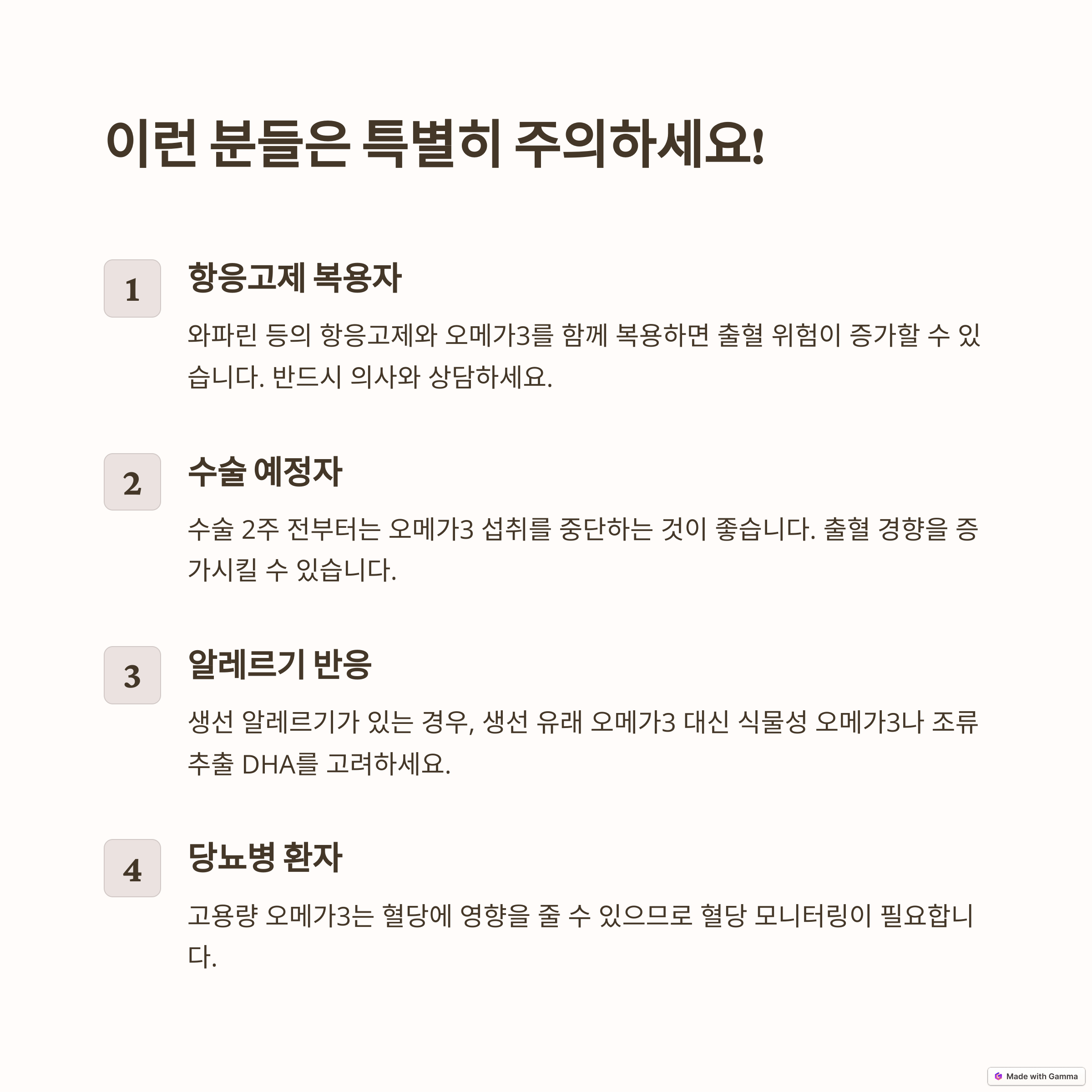 - 과다 섭취 시 부작용: 혈액 응고 지연, 위장 장애(메스꺼움, 설사, 복통 등), 알레르기 반응, 생선 비린내 등이 나타날 수 있습니다.