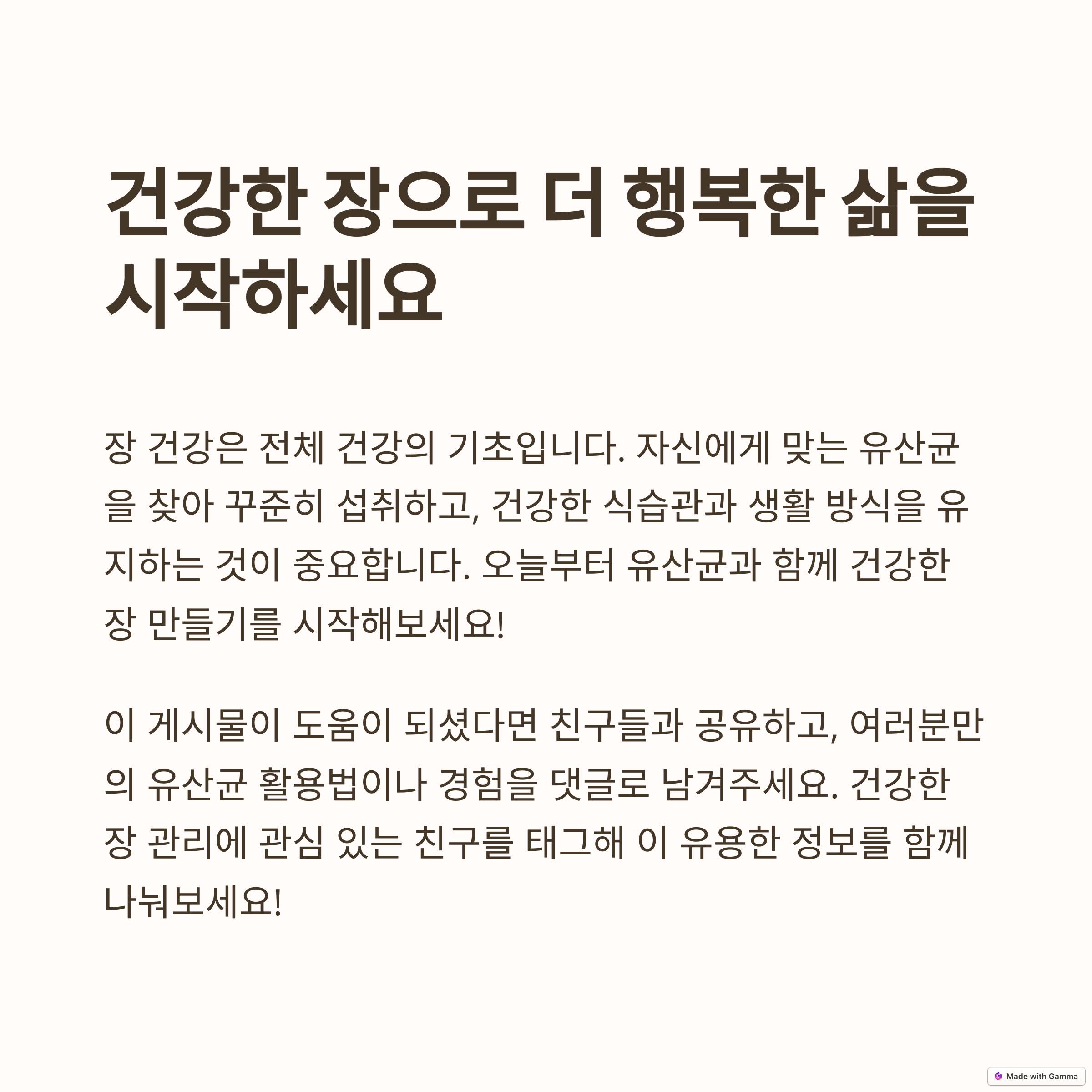 안녕하세요! 오늘은 장 건강의 핵심인 유산균에 대해 더욱 깊이 있게 알아보겠습니다. 유산균은 단순한 건강기능식품을 넘어 우리 몸의 균형을 유지하는 데 필수적인 요소입니다. 이 글에서는 유산균의 다양한 효능, 종류, 개인 맞춤형 선택 방법, 그리고 올바른 섭취 방법까지 꼼꼼하게 정리하여 제공합니다. 또한, 유산균과 함께 섭취하면 좋은 프리바이오틱스, 다양한 유산균 제품 비교, 그리고 유산균이 장 건강에 미치는 장기적인 영향까지 다루어 여러분의 건강한 삶을 돕고자 합니다. 궁금한 점이 있다면 언제든지 댓글로 문의해주세요!