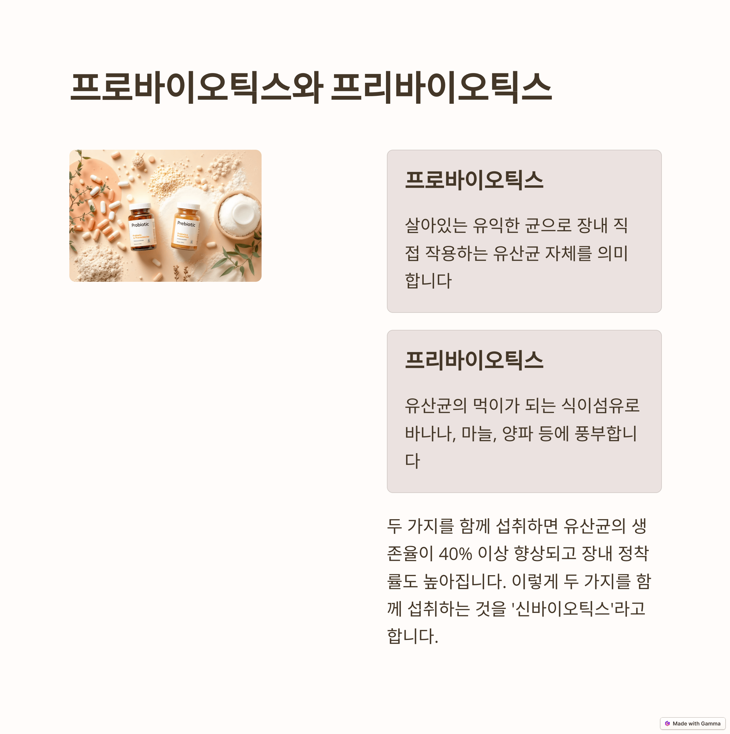 : 유산균과 프리바이오틱스를 함께 섭취하면 장내 유익균의 다양성을 증가시키고, 장 건강을 더욱 효과적으로 개선할 수 있습니다.
