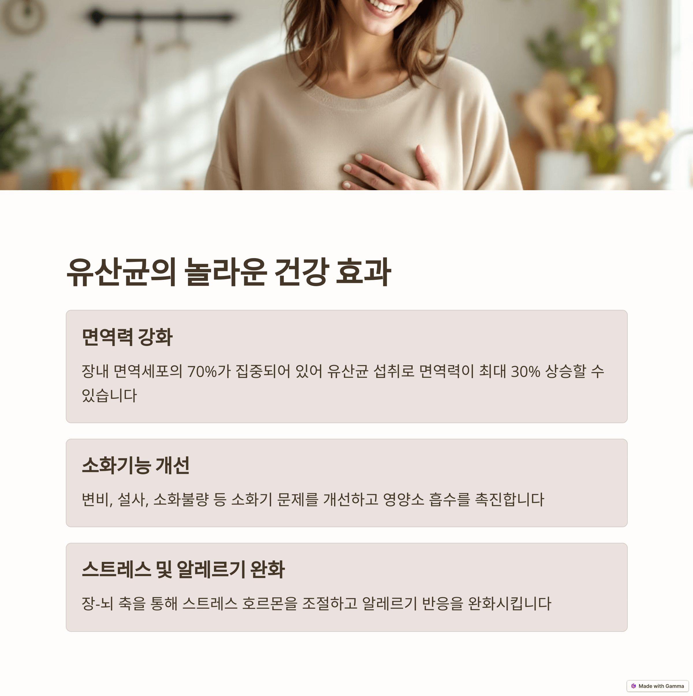 안녕하세요! 여러분의 장 건강을 넘어 삶의 질을 향상시켜줄 유산균, 제대로 알고 섭취하고 계신가요? 유산균은 단순한 건강기능식품을 넘어, 우리 몸 전체에 긍정적인 영향을 미치는 중요한 요소입니다. 이 글에서는 유산균의 핵심 효능과 함께, 유산균 섭취 효과를 극대화하고 건강한 생활 습관을 만드는 심층적인 비법을 속 시원하게 알려드리겠습니다. 마우스 클릭으로 원하는 정보를 바로 확인하세요!