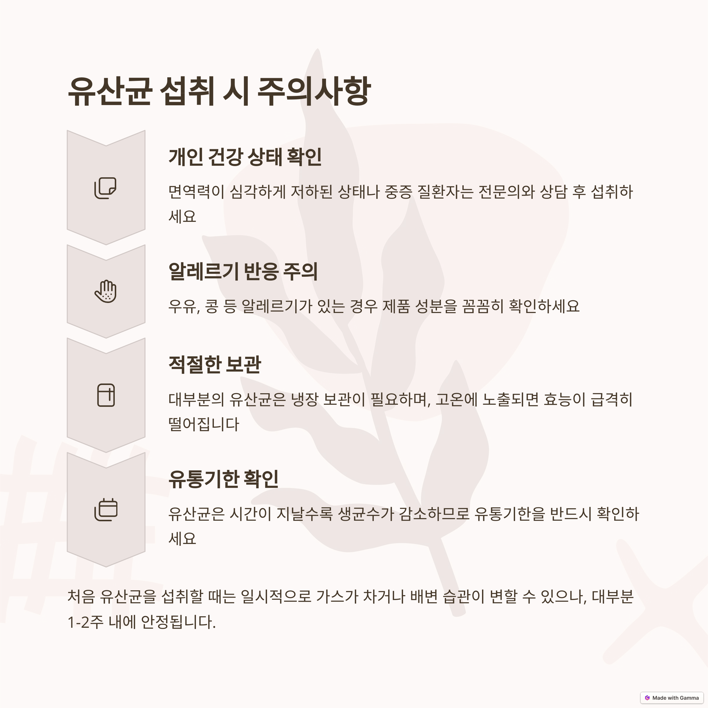 • 개인별 특성 고려: 특정 질환이 있거나 알레르기가 있는 경우, 전문가와 상담 후 유산균 제품을 선택합니다. 임산부, 수유부, 어린이는 유산균 섭취 전 반드시 전문가와 상담해야 합니다.