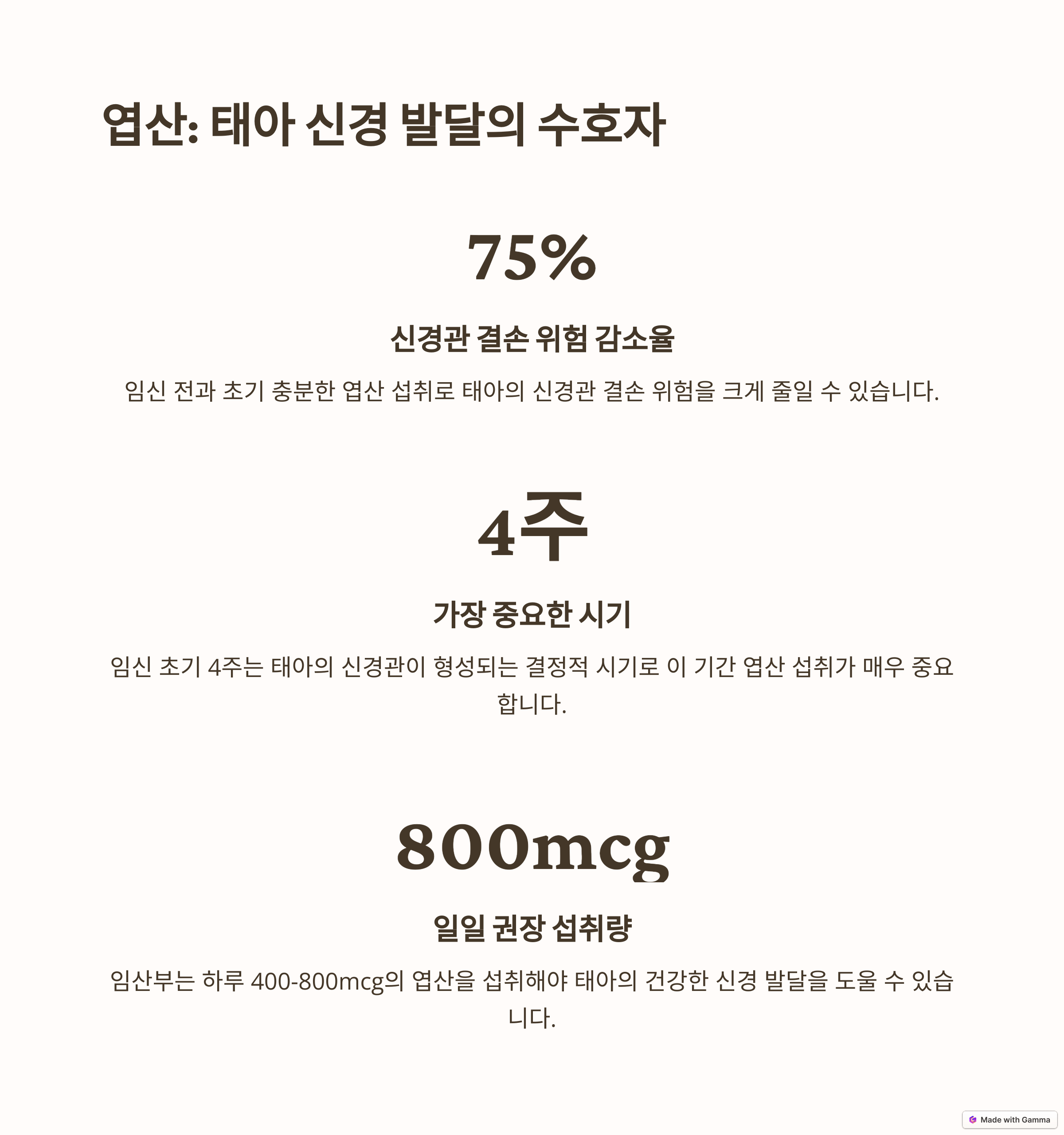 - 엽산: 엽산은 태아의 신경관 결손을 예방하는 데 매우 중요한 역할을 합니다. 신경관은 뇌와 척수로 발달하는 기관으로, 임신 초기에 형성됩니다. 엽산이 부족하면 신경관 결손으로 인해 뇌나 척추에 심각한 기형이 발생할 수 있습니다. 따라서 임신을 계획하고 있다면 임신 전부터 엽산을 충분히 섭취하는 것이 좋습니다. 일반적으로 임신 전 3개월부터 임신 12주까지 400~800mcg의 엽산을 섭취하는 것이 권장됩니다.