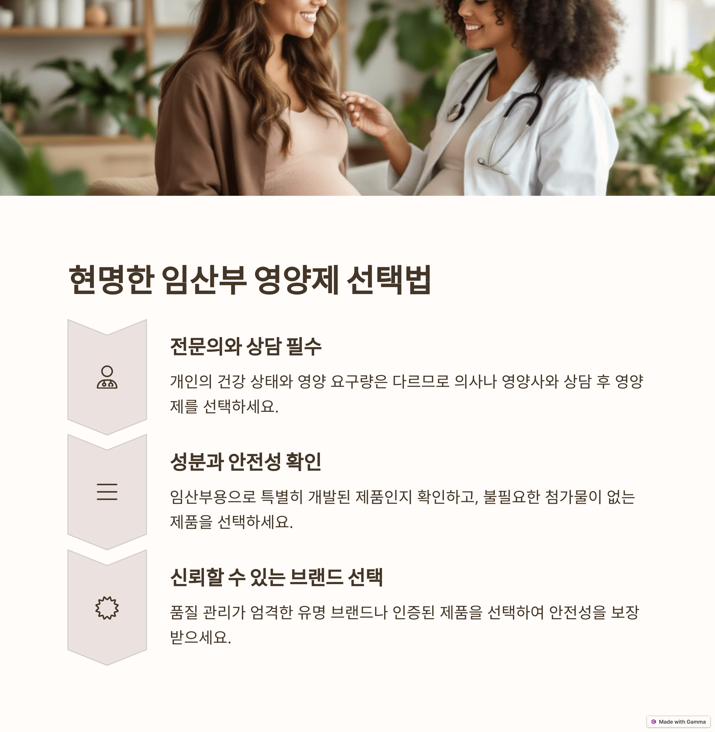 - 성분: 영양제의 성분을 꼼꼼히 확인하고, 필요한 영양소가 충분히 함유되어 있는지 확인합니다. 특히 엽산, 철분, 칼슘, 비타민 D, 오메가-3 지방산 함량을 확인하는 것이 좋습니다. 또한, 불필요한 첨가물이 들어있지 않은 제품을 선택하는 것이 좋습니다.