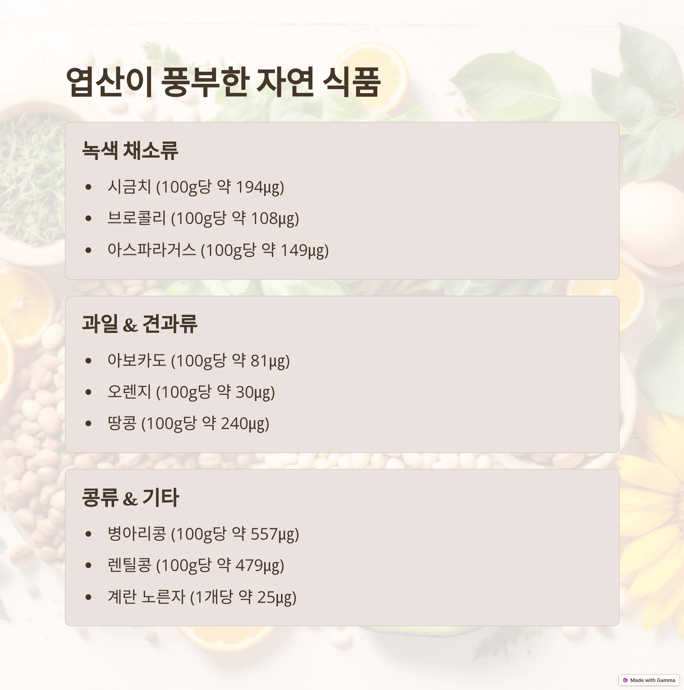 엽산은 다양한 음식을 통해 섭취할 수 있지만, 임산부에게 필요한 충분한 양을 충족하기 위해서는 엽산 영양제 복용이 권장됩니다.