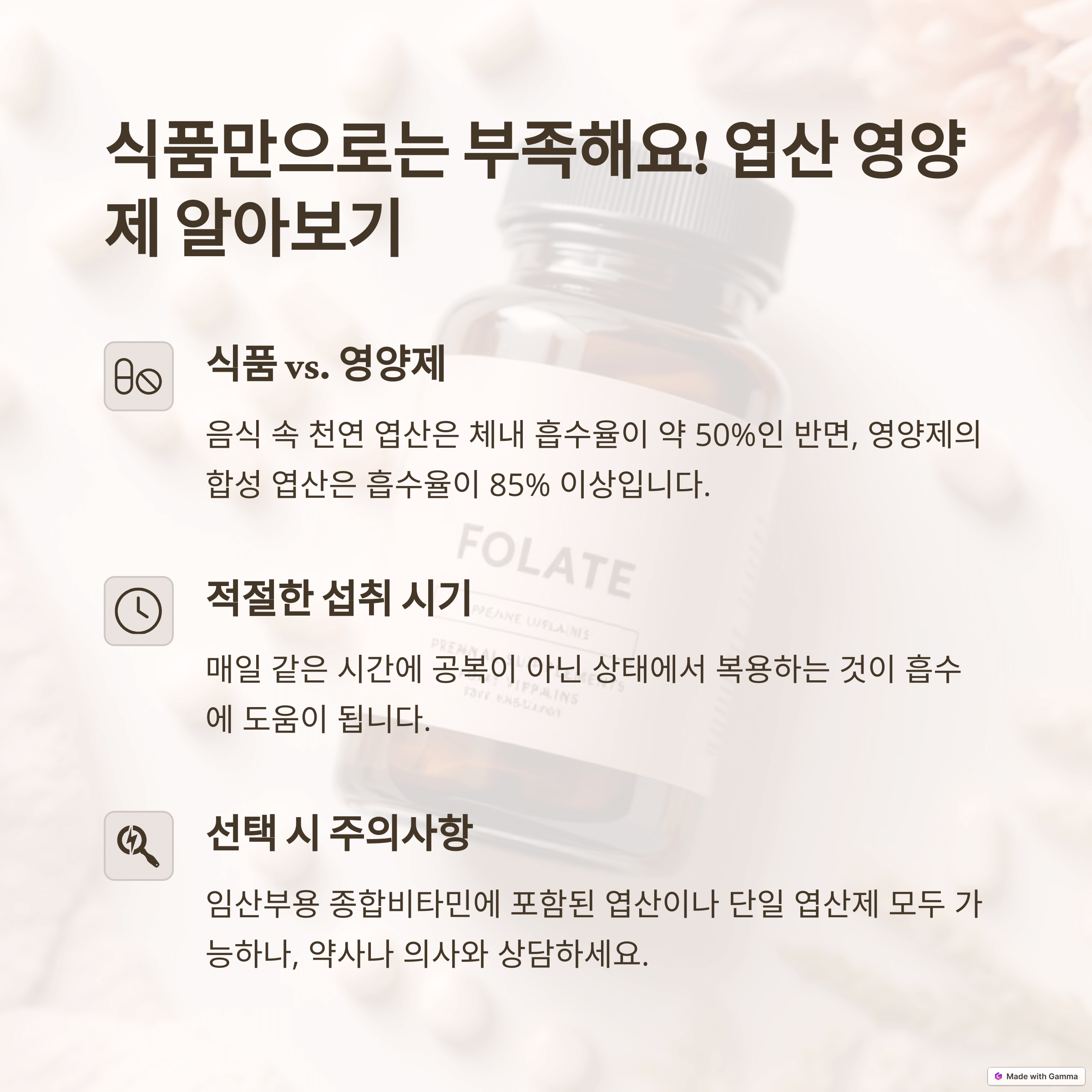 결론: 엽산, 건강한 임신을 위한 현명한 투자입니다. 엽산을 꾸준히 섭취하고, 건강한 생활 습관을 유지하여 행복하고 건강한 임신과 출산을 경험하시길 바랍니다.