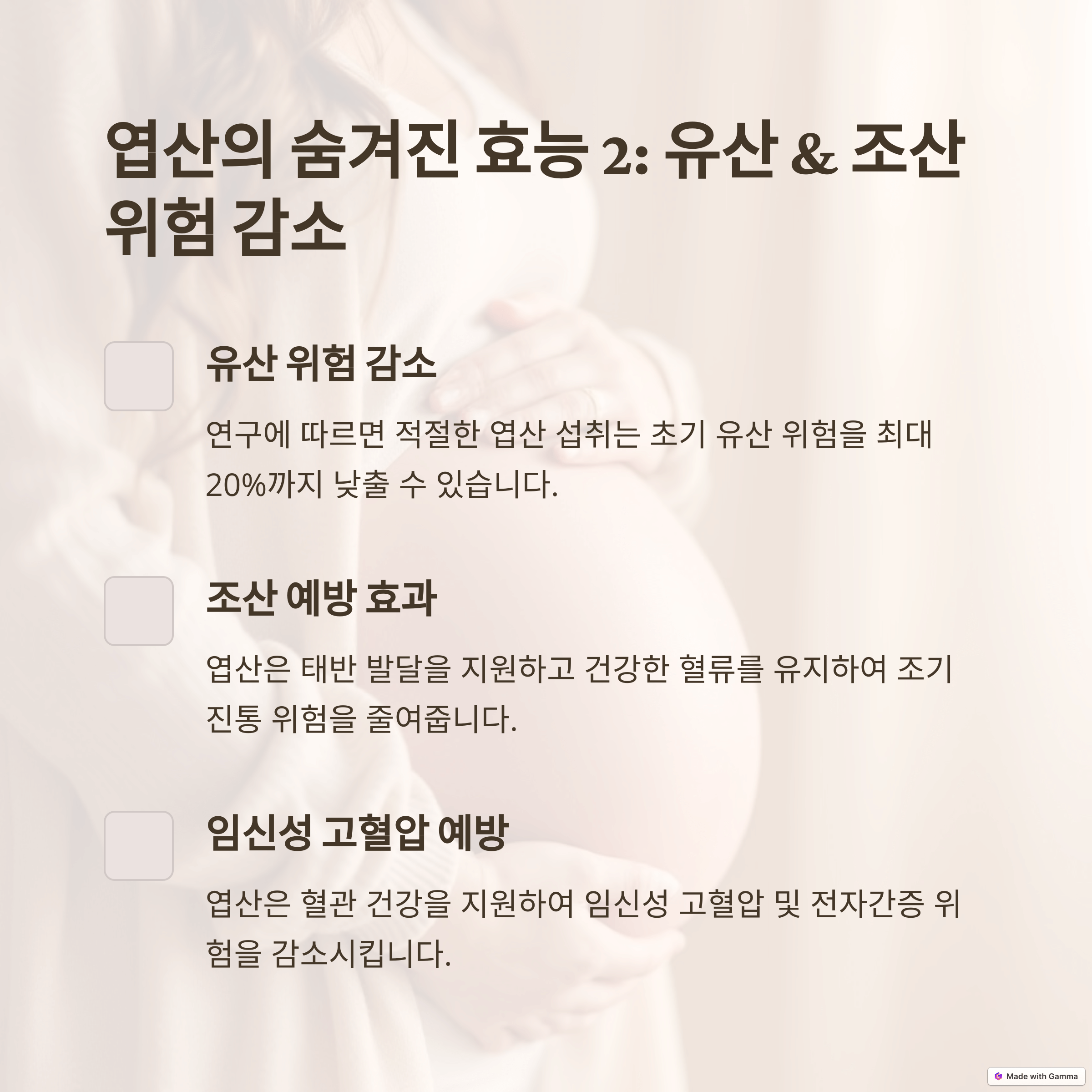엽산은 태아의 건강뿐만 아니라 임산부의 건강에도 광범위한 긍정적 영향을 미치는 중요한 영양소입니다.