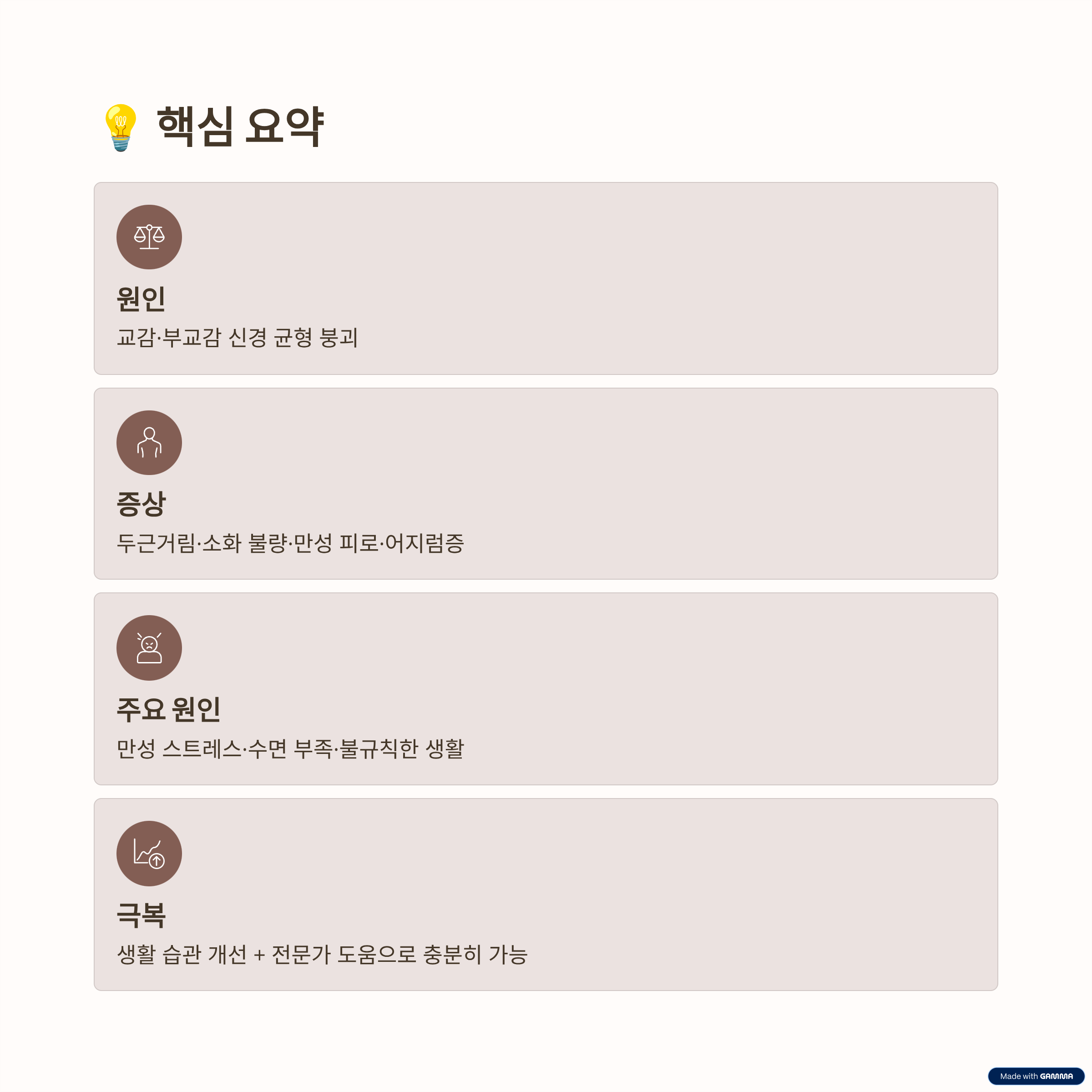 이러한 증상들은 스트레스나 피로가 심할 때 더욱 두드러지게 나타나는 경향이 있어요. 혹시 이 중 여러 가지 증상으로 고통받고 계시다면, 자율신경실조증을 의심해 볼 필요가 있습니다.